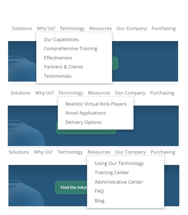 The next thing most visitors will likely want to know is if SIMmersion’s library of off-the-shelf solutions has the training they want. To accommodate this need, the training systems have been divided into categories that visitors see on the home page. They can also go to the “Solutions” drop-down menu, pictured in Figure 2, to find a list of links leading to information on various virtual role-player systems.