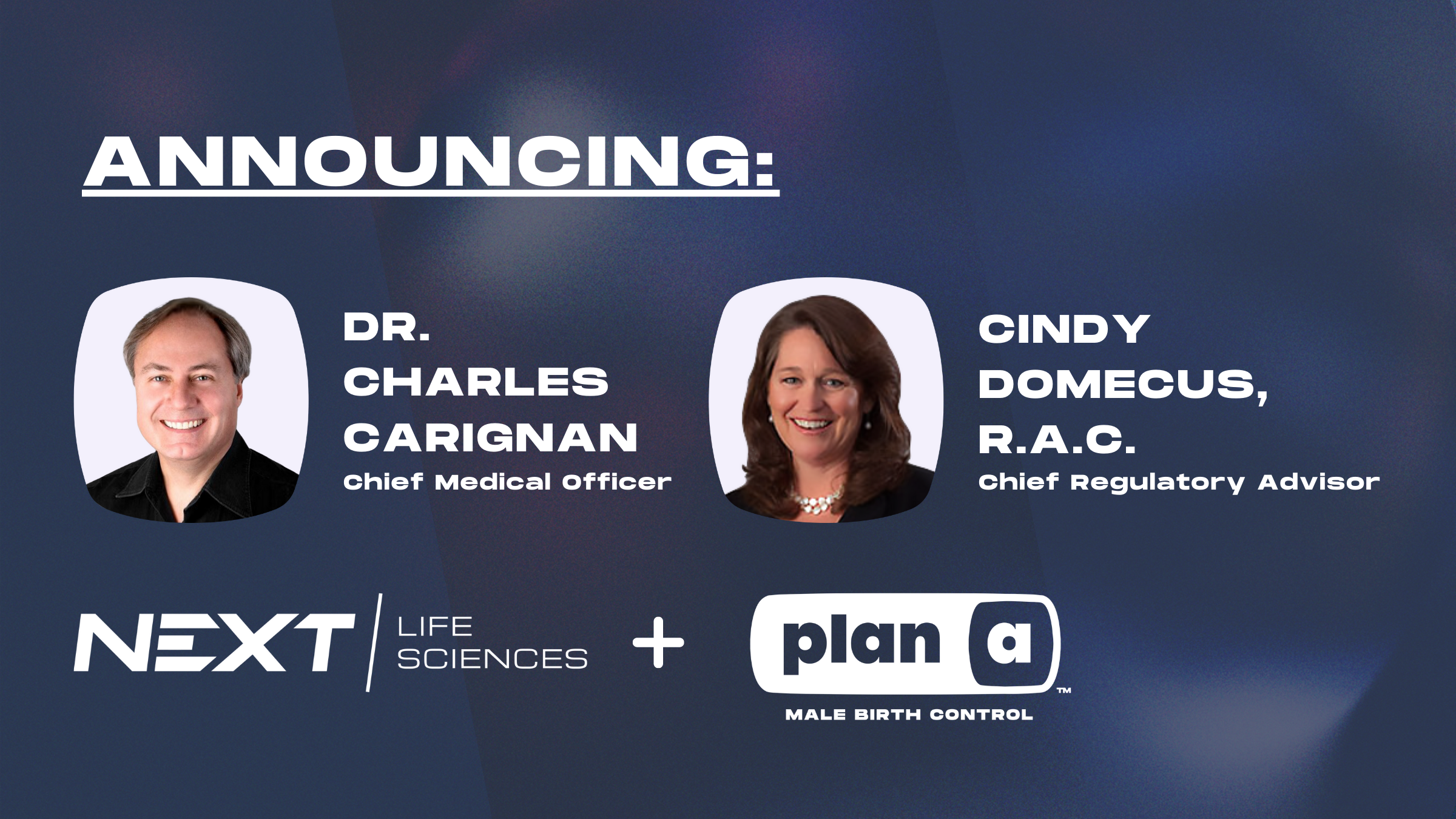 LOS ANGELES, CALIFORNIA, UNITED STATES, July 18, 2023/EINPresswire.com/ — NEXT Life Sciences, the team developing Plan A™, a long-lasting, reversible contraceptive for men, announced today its appointment of Dr. Charles Carignan as its Chief Medical Officer and its new Chief Regulatory Advisor, Cindy Domecus, R.A.C.