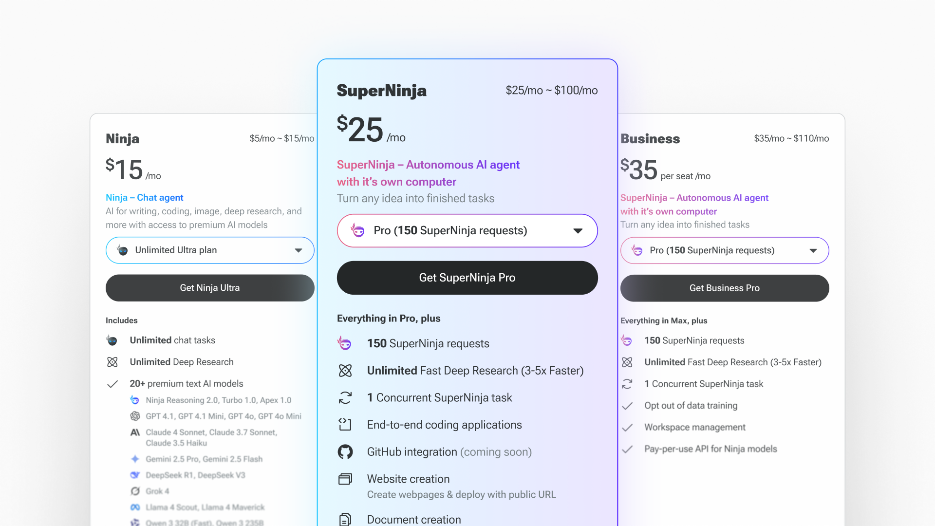 Ninjatech AI will start offering their new SuperNinja plans starting July 30th, 2025 and are available in three different plans: Pro, Ultra, and Max, starting at $25/month. Users can experience SuperNinja at: super.myninja.ai, and pricing details can be found at: www.ninjatech.ai/pricing.