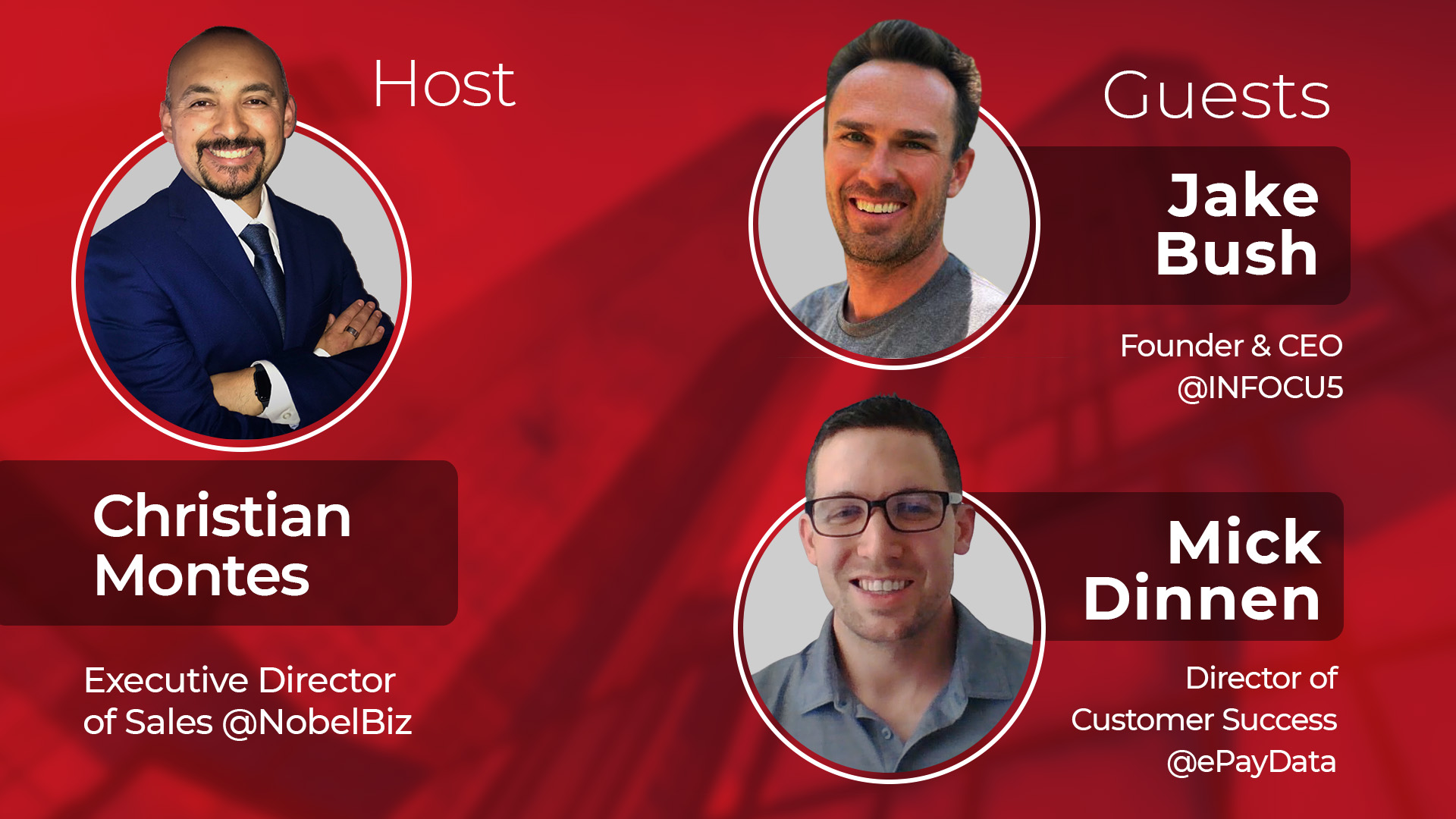 In this new webinar episode, host Christian Montes (Director of Sales @ NobelBiz) welcomes Mick Dinnen (Director of customer success @ ePayData) and Jake Bush (Founder & CEO @ INFOCU5) to talk about the technical requirements of credit card processing, compliance, and a host of other interesting tips and tricks to implement an effective and productive payment journey.