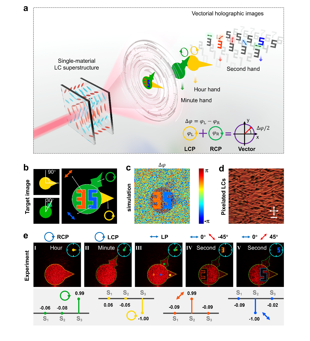This new method (https://doi.org/10.1186/s43593-024-00061-x) overcomes this limitation by employing a single layer of LCs. LCs are known for their ability to change their properties under an electric field, making them ideal for dynamic control. The researchers developed a novel encoding method that allows LCs to display versatile and tunable vectorial holography, where both polarization and amplitude can be controlled independently at different positions.