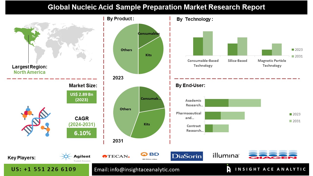 JERSEY, NJ, US, March 27, 2024 /EINPresswire.com/ — InsightAce Analytic Pvt. Ltd. announces the release of a market assessment report on the “Global Nucleic Acid Sample Preparation Market – (By Product (Consumables (Kits (DNA/RNA Sample Isolation/Extraxtion/Purification, DNA/RNA Clean-Up and Concentration, DNA and RNA Quantification), Reagents), Instruments), By Technology (Silica-Based, Magnetic Particle Technology, Other Technologies), By Source Type (Cell-Free (By Sample (Blood, Serum/Plasma, Other Sources), By Application (Parental and Hereditary Testing, Tumor Testing, Transplantation), Genomic (Blood, Body Fluids, Buccal, Cell/Cultured Cell, FFPE, Forensic, Plant, Saliva/Swab, Serum/Plasma, Tissue, Stool, Urine, and Other Samples), Microbe (Bacterial, Fungus, Yeast, Other Sources), Plasmid (GigaPrep, MaxiPrep, MegaPrep, MidiPrep, MiniPrep), Viral), By Application (PCR, qPCR, NGS, Cloning, Microarray, Blotting Techniques, Other Applications), By End-user (Academic Research Institutes and Laboratories, Pharmaceutical and Biotechnology Companies, Contract Research Organizations (CROs), Clinical Diagnostic Centers, Applied Testing (Forensic, Biobanks))), Trends, Industry Competition Analysis, Revenue and Forecast To 2031.”