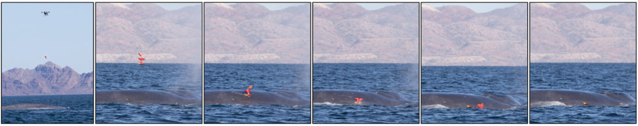 This work shows that UAVs are capable of attaching biologging tags to free-swimming large whales. This method may hold advantages for studying vulnerable or hard to study species by potentially reducing stress from tagging activities. The work was carried out in collaboration with researchers from Ocean Alliance, Stellwagen Bank National Marine Sanctuary, Universidad Autónoma de Baja California Sur, University of Michigan, and Syracuse University.