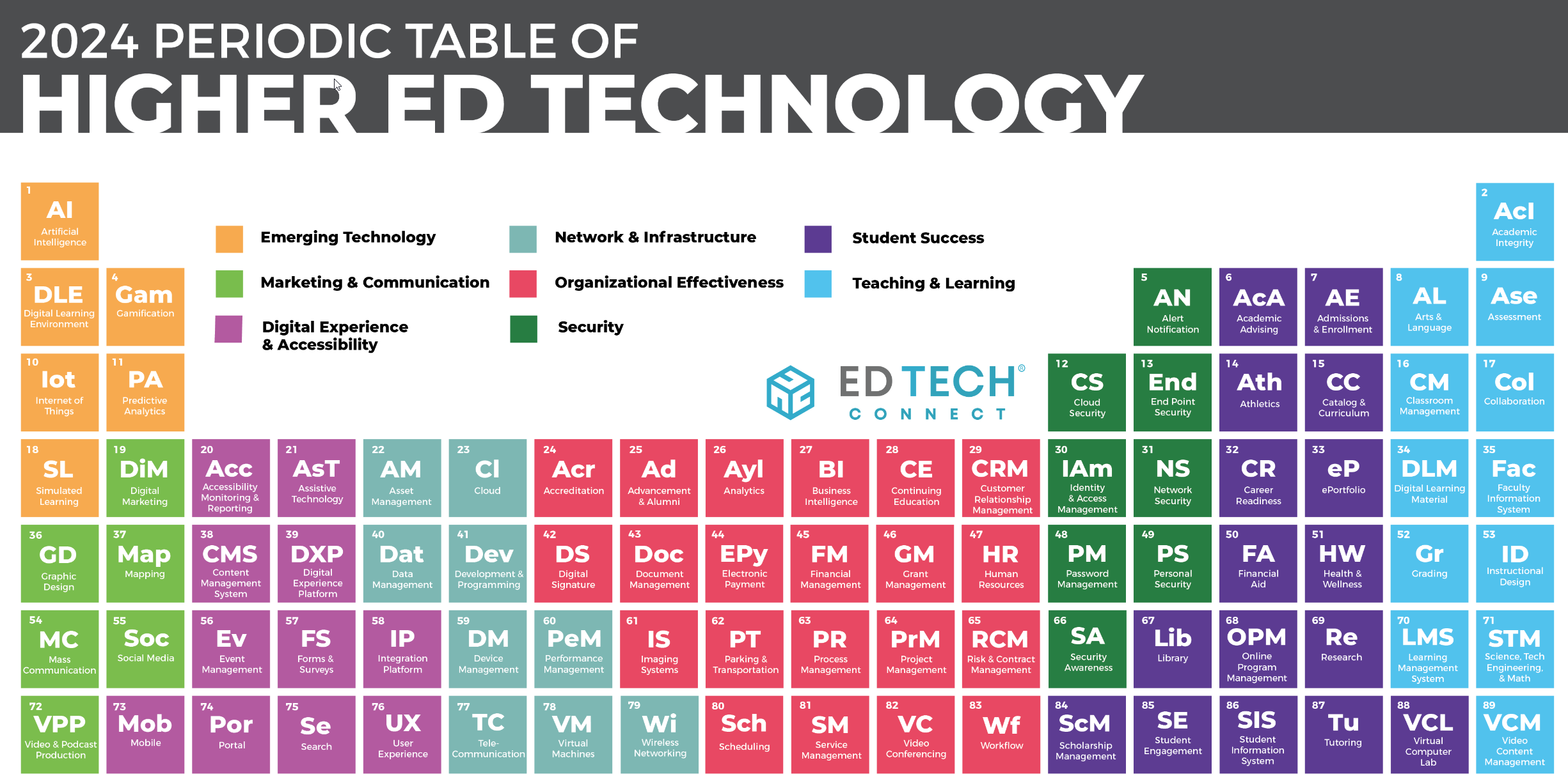 The 2024 Periodic Table of Higher Ed Technology includes all EdTech Connect software topics by category. All solution providers have been reviewed by a Higher Education experts