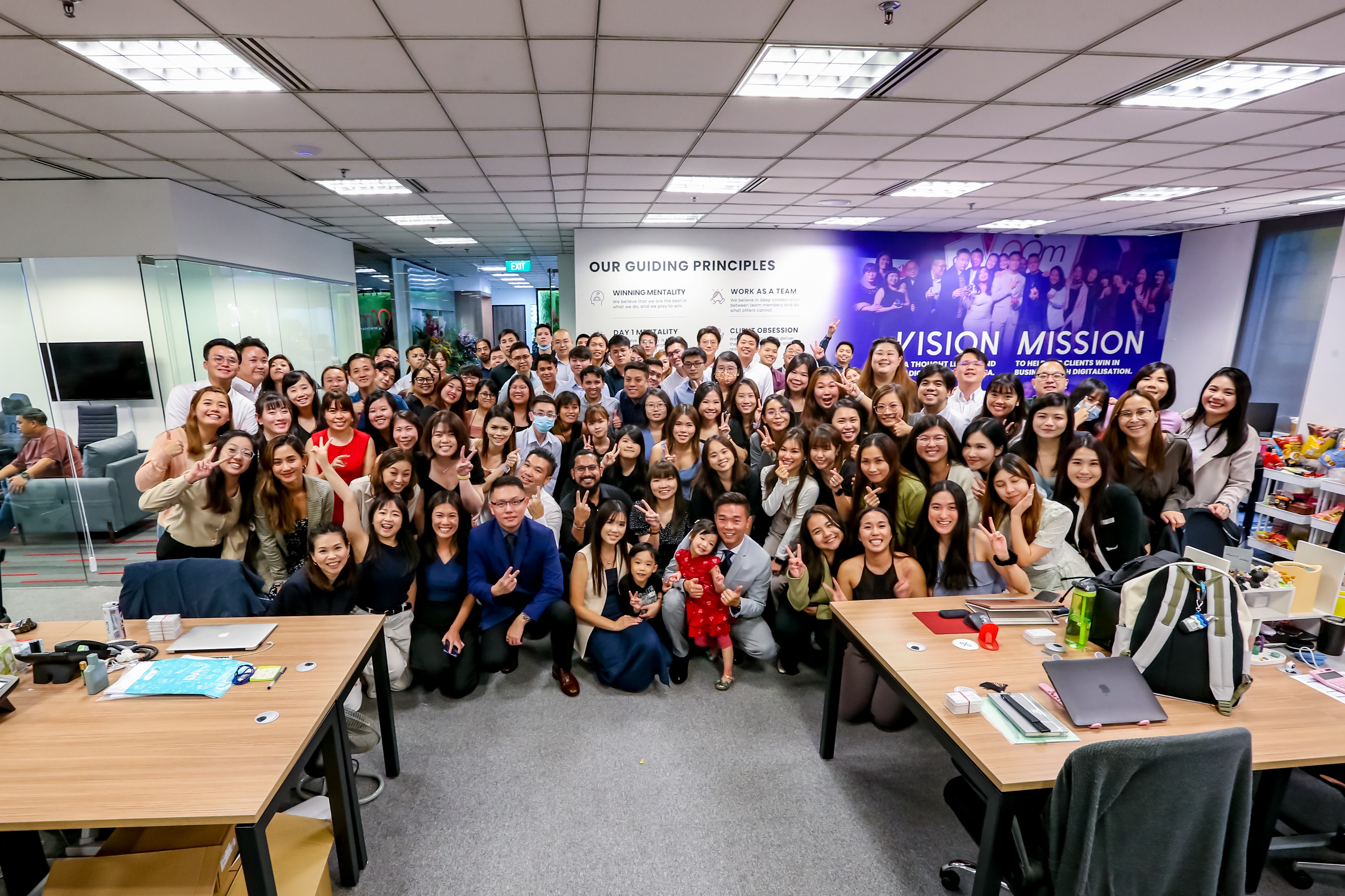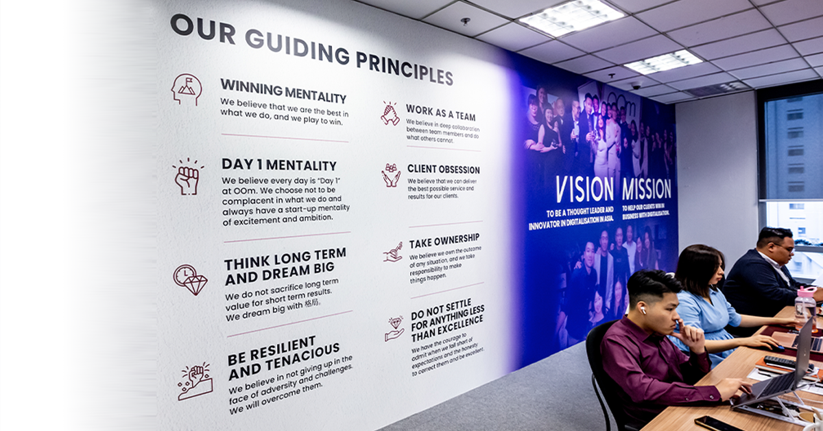 The new office housed a mural wall with OOm’s beliefs, values and guiding principles. The murals state OOm’s Vision: To be a thought leader and innovator in Asia: and OOm’s Mission: To help our clients win in business with digitalisation.