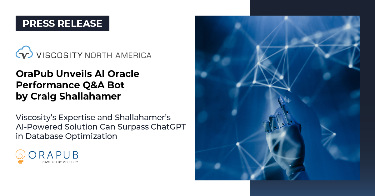 PLANO, TEXAS, UNITED STATES OF AMERICA, June 7, 2023/EINPresswire.com/ — OraPub, powered by Viscosity North America, Inc. (“Viscosity”), has introduced an Oracle Performance Q&A Bot specifically designed to address questions and provide solutions related to Oracle database performance tuning and optimization. The bot is developed by Craig Shallahamer, the Founder of OraPub, an Oracle ACE Director, and the Applied AI Scientist at Viscosity. It possesses in-depth knowledge of Oracle-specific performance tuning techniques, SQL optimization strategies, indexing, caching, and other relevant concepts. The training data for this bot, in addition to Viscosity’s resources, is gathered from Shallahamer’s extensive documentation, performance tuning guides, and best practices. It also incorporates real-world performance-related scenarios and topics addressed in Shallahamer’s training materials, books, presentations, videos and webinars.