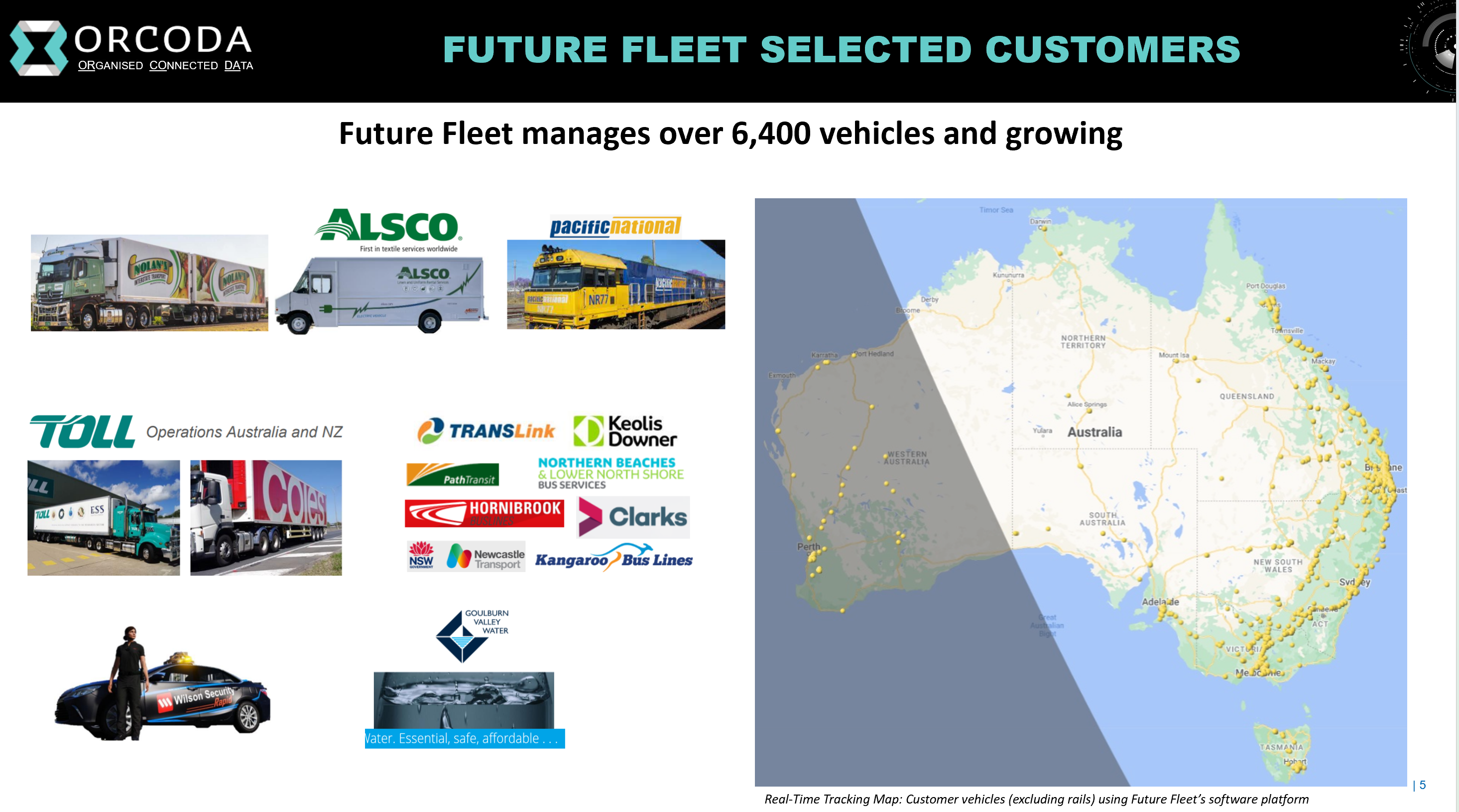 • Future Fleet, established in 2003 and based in Brisbane, is a world-class provider and innovator of advanced fleet management systems. The company, which has their devices and services in over 6,400 vehicles nationwide, boasts a ~A$3.5 revenue in FY22 and will substantially increase ORCODA’s recurring revenue.