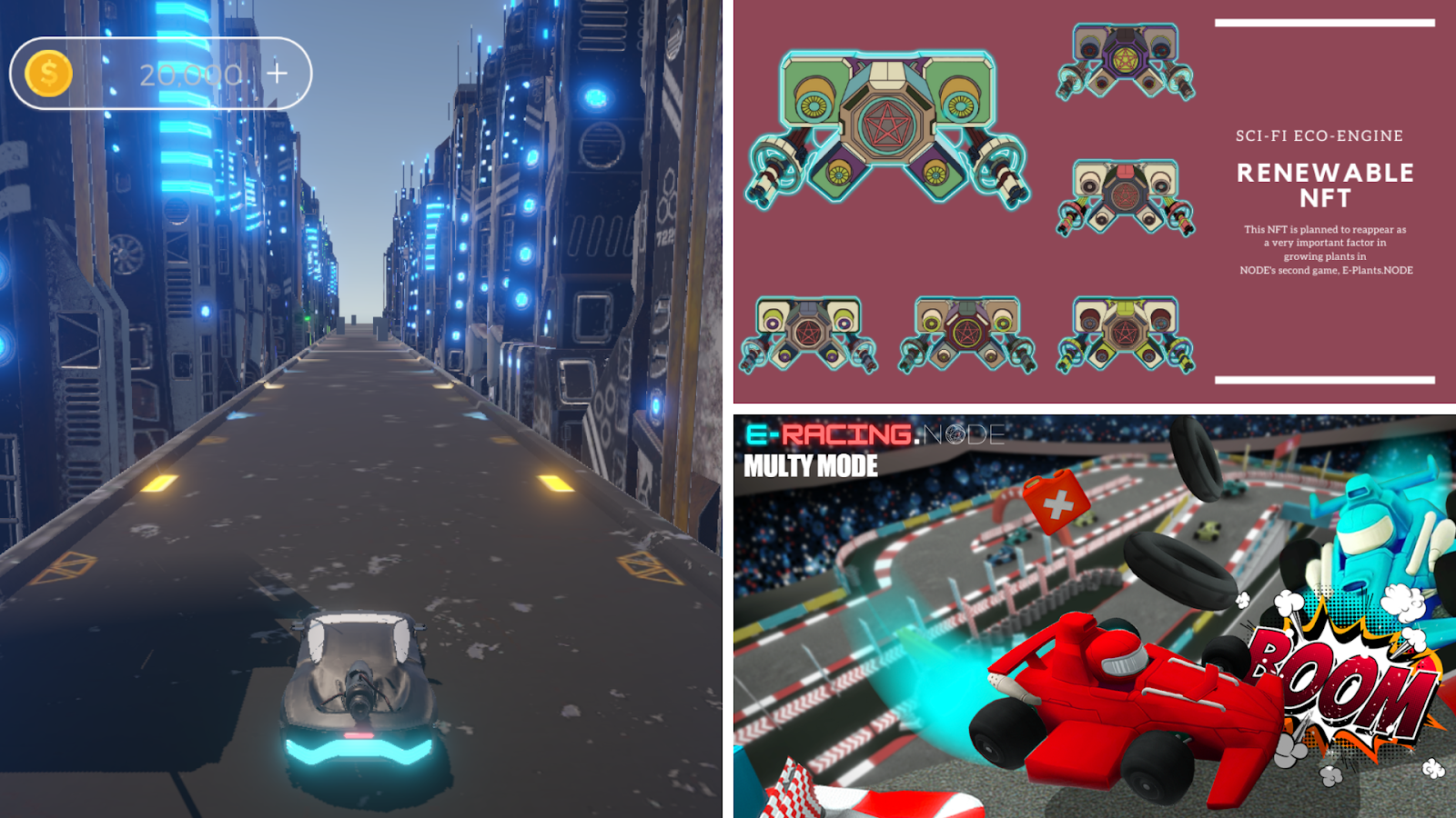 E-Racing.NODE is a game set in the future, in which users race in their car after installing a Sci-Fi car engine NFT. This NFT is planned to reappear as a very important factor in growing plants in NODE’s second game, E-Plants.NODE. In the third game, the NFT in the first game and the NFT in the second game are both renewable. The game is also designed to benefit users beyond simple use. This suggests that the project will continue and presents great economics at the same time. As a result, there is finally a solution for anxious individuals holding NFTs, which became data fragments due to a rug pull or inflation, a reason to deviate from the pattern aimed only at simply cashing in on P2E. The meaningful gaming of holders is not over there. It has a system that contributes to the environment just by enjoying E-Racing.NODE.