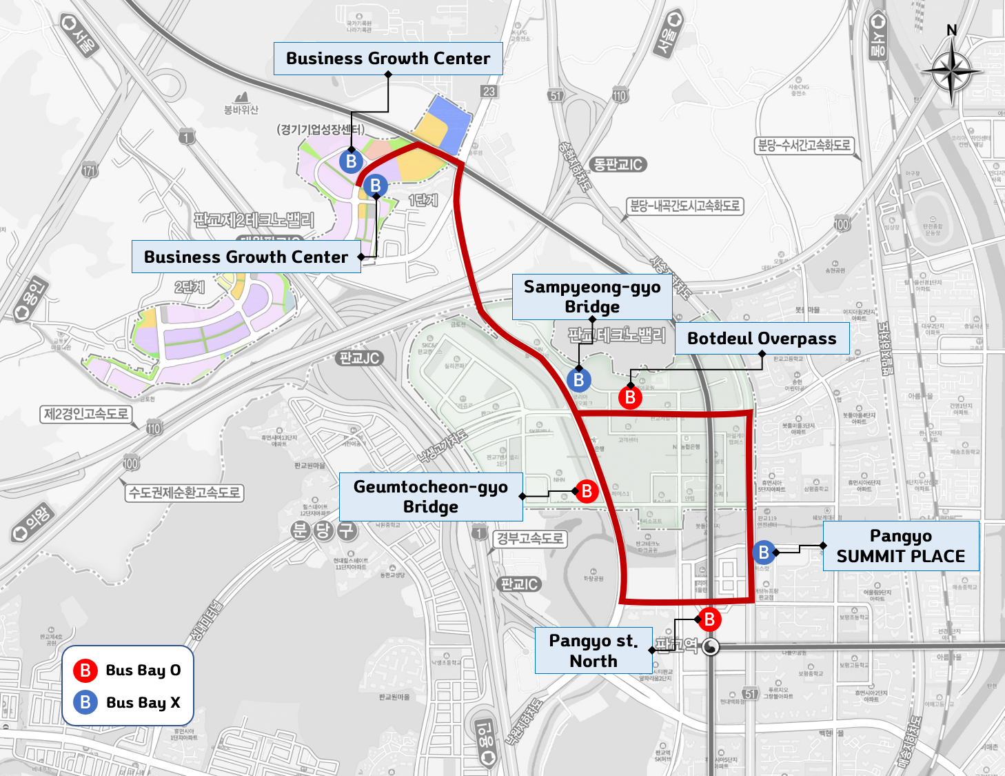 Pangyo Techno Valley is recognized as a leading industrial cluster in South Korea, densely populated with prominent companies and institutions. It is considered one of the representative areas facing frequent traffic congestion during commuting hours, posing challenges for public transportation use. Additionally, accessibility and convenience of movement between the first Pangyo (located in Sampyeong-dong, Seongnam City) and the second Pangyo (including areas in Sihyeong-dong and Geumto-dong) remained obstacles.