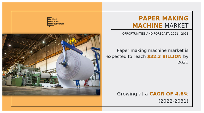 According to a new report published by Allied Market Research, titled, “Paper Making Machine Market,” The paper making machine market size was valued at $20.4 billion in 2021, and is estimated to reach $32.3 billion by 2031, growing at a CAGR of 4.6% from 2022 to 2031.
