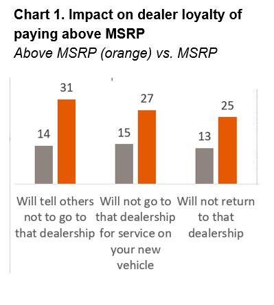 Not surprisingly, all of these concessions and disappointments are making an impression on auto purchasers – but the depth of their resentment may surprise sellers and manufacturers alike. Three in ten (31%) buyers who paid above MSRP said they would tell others not to go to the dealership they used – roughly double the level (14%) for those who simply paid MSRP. (See Chart 1.)