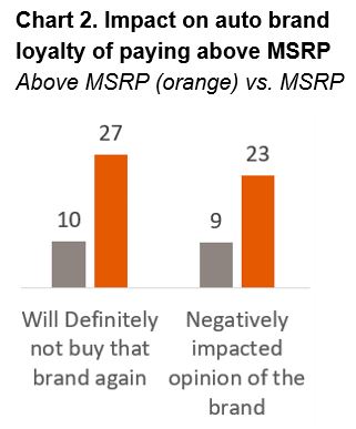 GfK found equally strong negative feelings toward car brands themselves. One-quarter (27%) of those who purchased above MSRP said they would never buy the same brand again, compared to just 10% of those who simply paid the suggested price. (See Chart 2.)