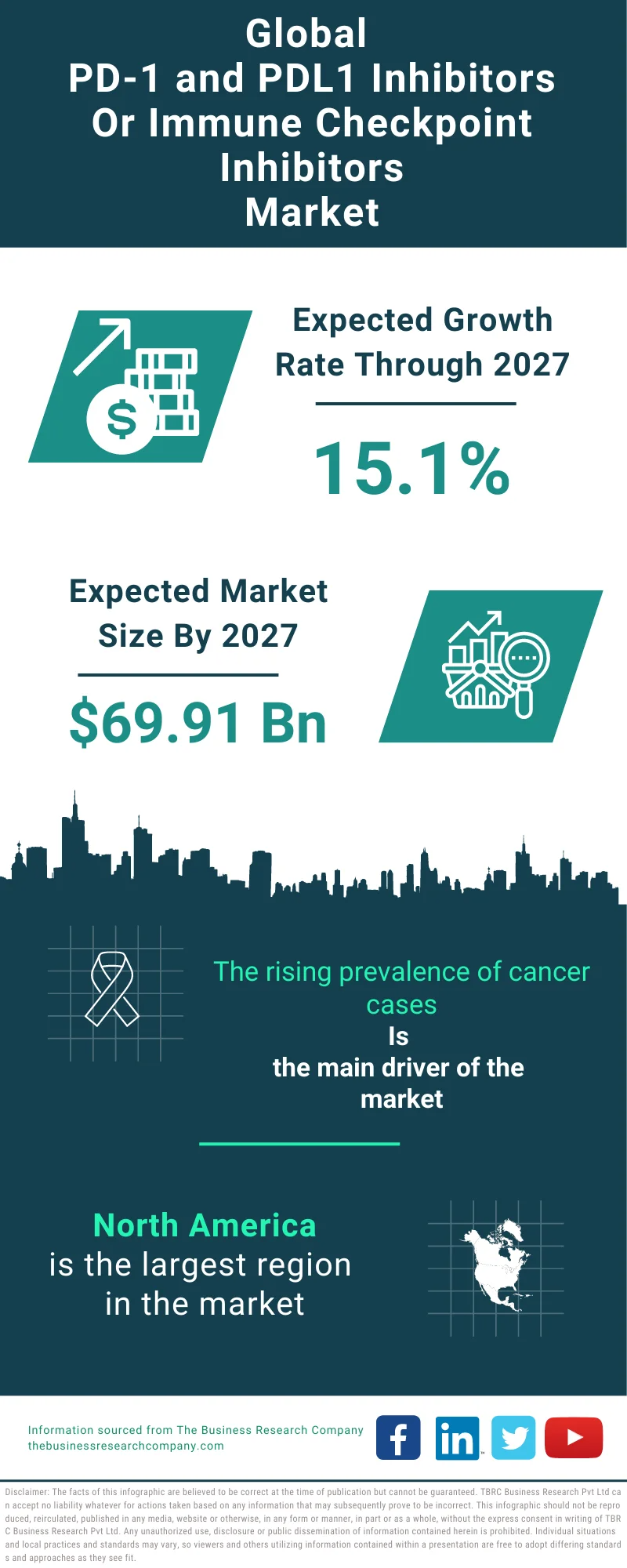The “PD-1 and PDL1 Inhibitors or Immune Checkpoint Inhibitors Global Market Report 2023” provided by The Business Research Company offers a comprehensive analysis of the PD-1 and PDL1 inhibitors or immune checkpoint inhibitors market. According to TBRC’s forecast, the PD-1 and PDL1 inhibitors or immune checkpoint inhibitors market is expected to reach $69.91 billion by 2027, with a Compound Annual Growth Rate (CAGR) of 15.1%.