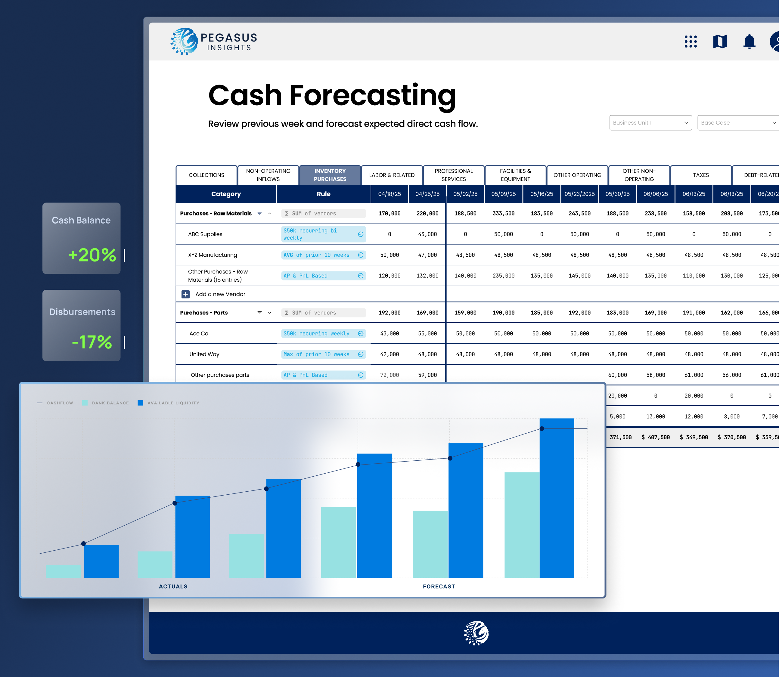 Pegasus Insights is a modern liquidity and forecasting platform purpose-built for mid-market companies navigating private equity ownership, complexity, and capital pressure. The platform helps CFOs and finance teams take control of their liquidity with real-time cash visibility, automated 13-week forecasting, and working capital insights—all from one centralized dashboard. Pegasus is SOC 2 Type I certified and trusted by finance leaders across industries including manufacturing, healthcare, SaaS, and business services.