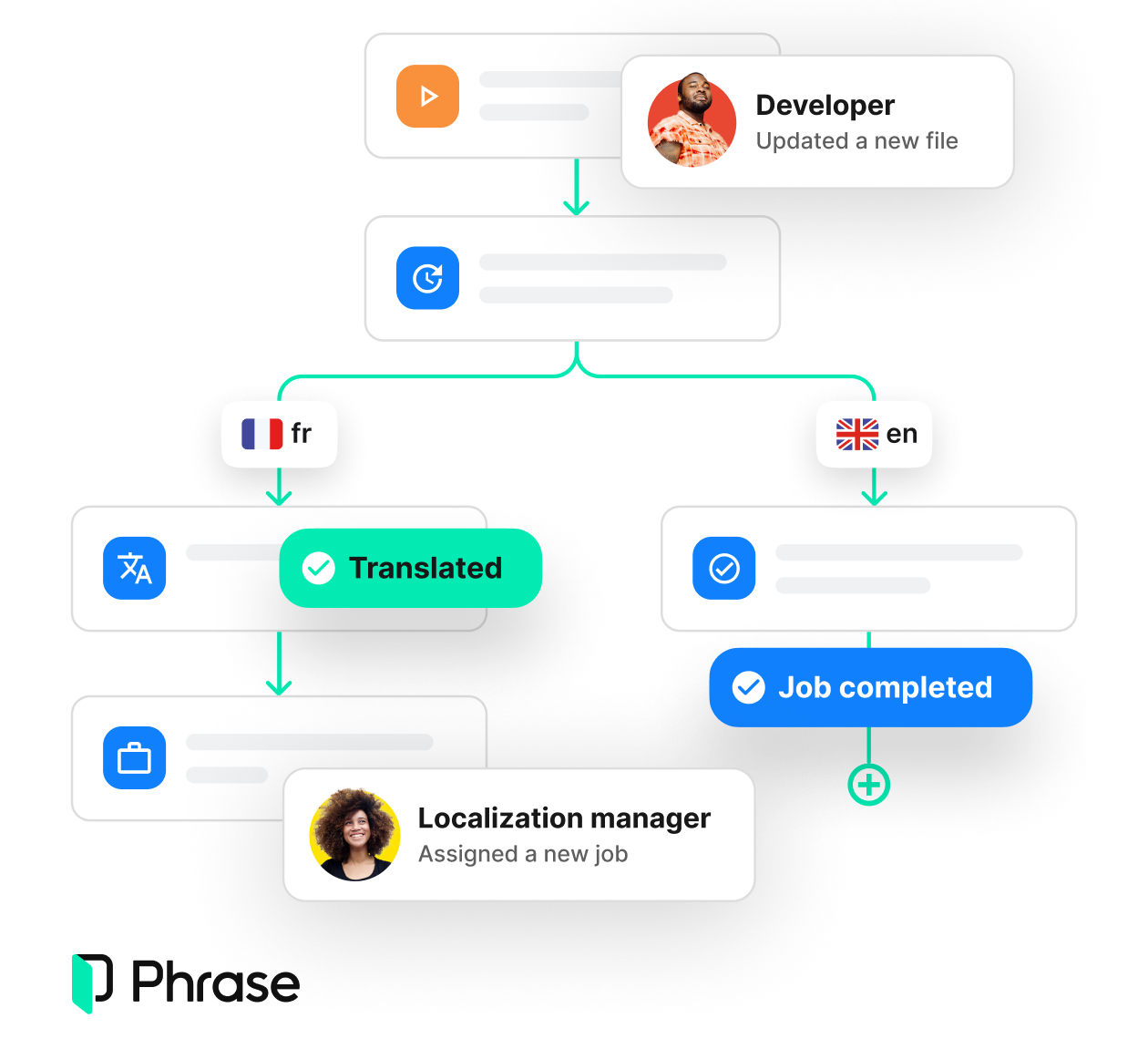 Prior to Phrase Orchestrator, building efficient localization workflows was a cumbersome and resource-heavy process, involving many stakeholders, manual coordination, and teams of developers or third-party agencies. With its no-code interface, Phrase Orchestrator enables localization teams to easily build streamlined workflows according to their needs and business logic, using the unrivaled functionality of the entire Phrase Localization Suite. Employing the graphical drag-and-drop interface in Phrase’s intuitive workflow editor, teams can experiment with, and evolve, their own custom automations—leaving costly middleware, lengthy feature requests, and inefficient process adaptation behind, adding unparalleled speed and control to the localization process.