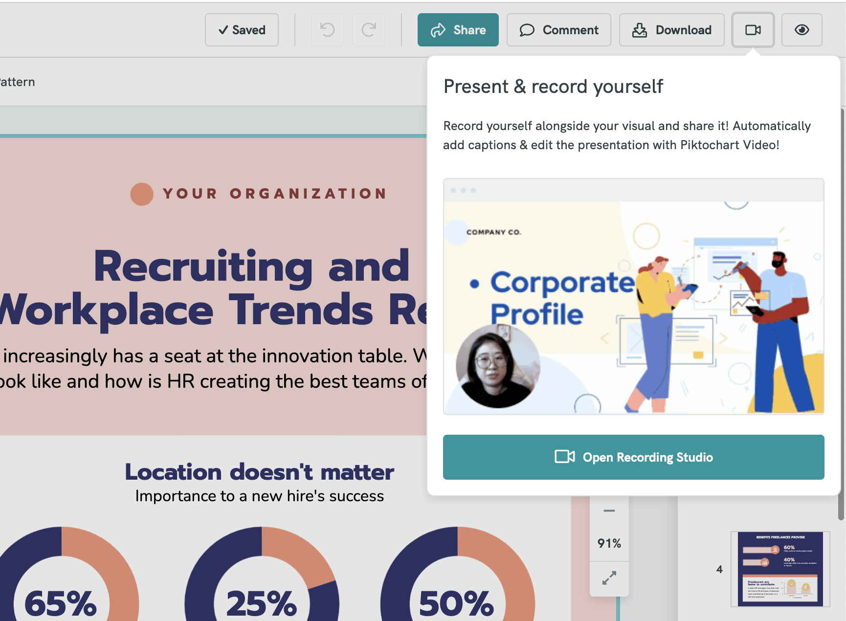 “We want to make visual communication as easy as possible for our users. This includes not having to use separate tools for each function. Within the Piktochart editor, users are now able to record themselves while they present their visual—could be an infographic or poster they’re working on or a business presentation they want to send to a client or colleague. Suppose they want to add captions to the presentation and edit the video. In that case, they can easily switch to Piktochart Video within the same dashboard,” said Girithaara Ramanan, Product Design Lead at Piktochart.