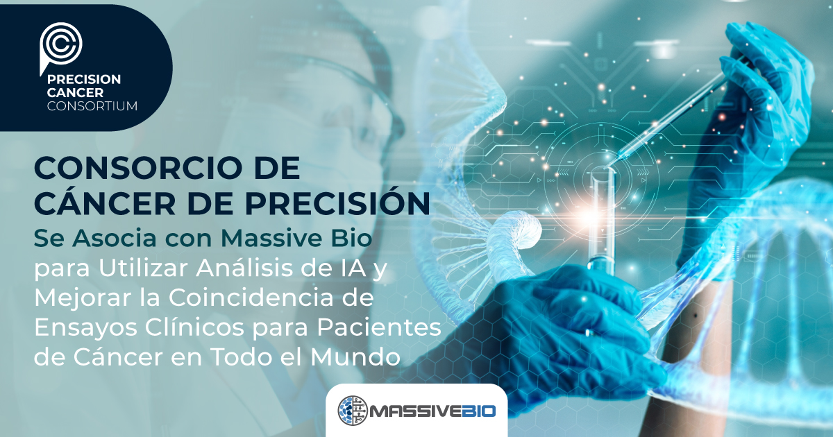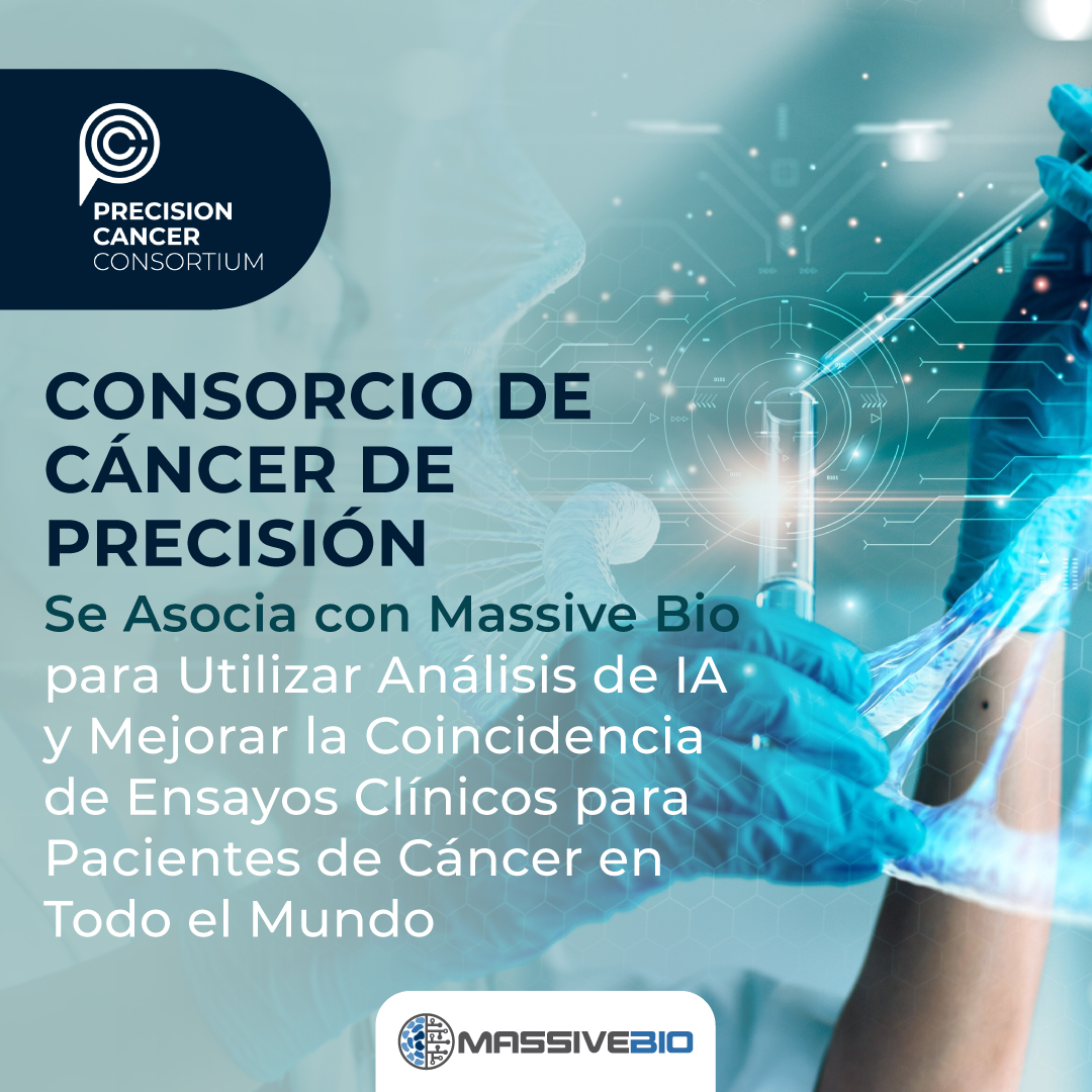UNITED STATES, October 10, 2023 /EINPresswire.com/ — Massive Bio, empresa líder en análisis de inteligencia artificial (IA) especializada en oncología de precisión, ha sido seleccionada por el Precision Cancer Consortium (PCC), Una agrupación de empresas globales, biofarmacéuticas que tienen como objetivo optimizar el emparejamiento de ensayos clínicos a través de su innovador sistema de análisis de IA. PCC se estableció en 2022 con la visión compartida de permitir el acceso a pruebas integrales para todos los pacientes con cáncer en todo el mundo y actualmente está compuesto por Roche/Genentech, Novartis, GSK, Bayer, Eli Lilly & Company, Johnson & Johnson/Janssen y AstraZeneca. La asociación incorporará protocolos de ensayos clínicos de miembros del PCC y criterios de inclusión y exclusión de pacientes en algoritmos de emparejamiento de aprendizaje automático existentes en SYNERGY-AI aprovechados dentro del Sistema de emparejamiento de ensayos clínicos de aprendizaje profundo (DLCTMS) de Massive Bio. Esto optimizará la calidad y eficiencia del emparejamiento de los pacientes con los ensayos en todos los programas patrocinadores y mejorará el acceso de los pacientes a pruebas específicas de secuenciación de próxima generación (NGS) e intervenciones personalizadas.