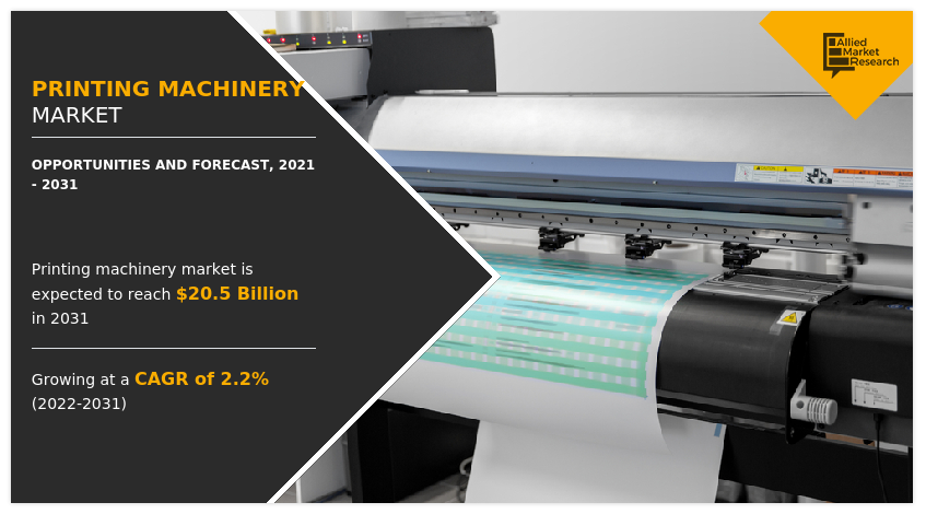 As AMR Says,The printing machinery market size was valued at $16.5 billion in 2021, and is estimated to reach $20.5 billion by 2031, growing at a CAGR of 2.2% from 2022 to 2031.