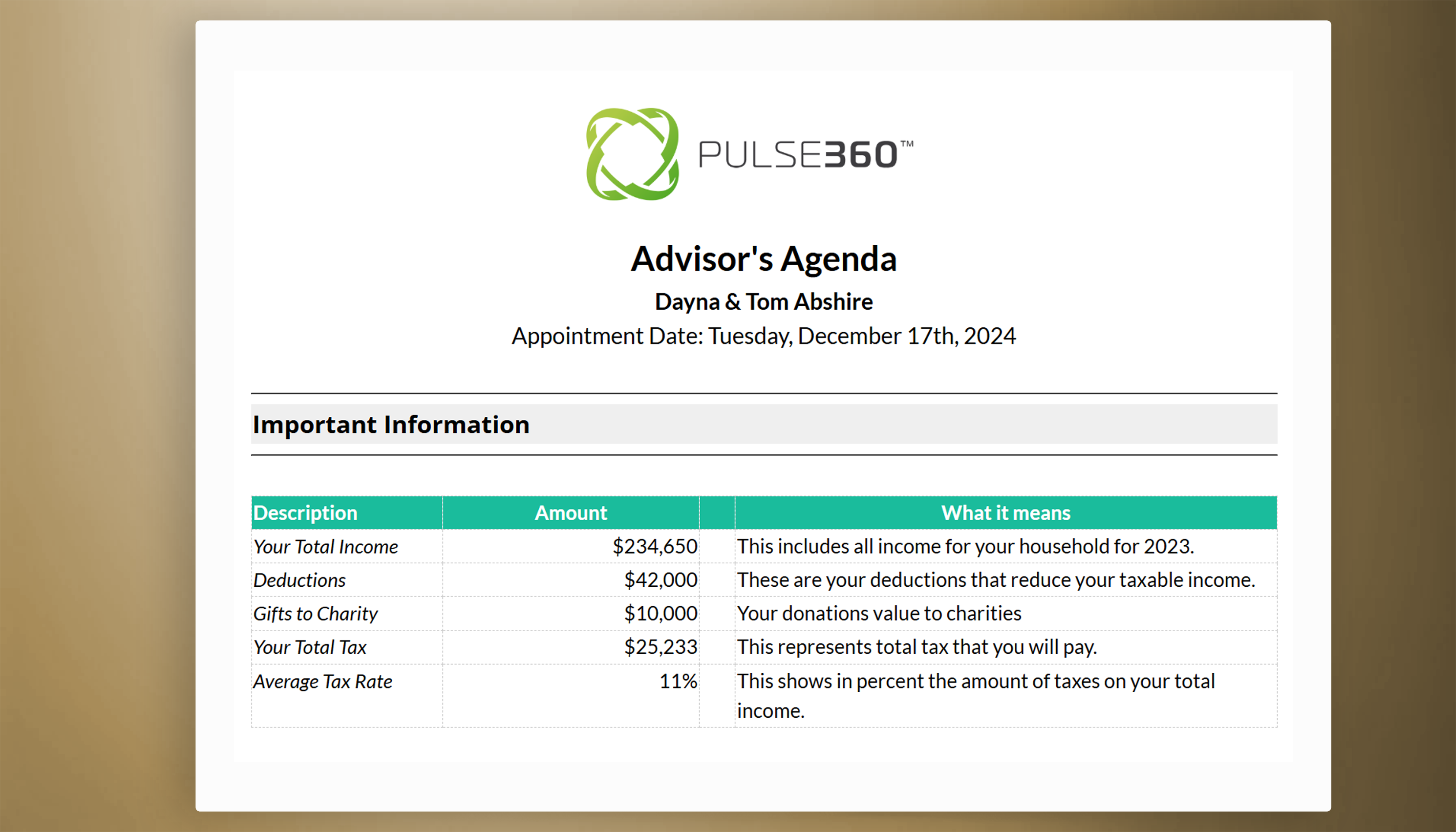 Pulse360, a 2024 AdviceTech Live Community Award recipient, a 2021 & 2023 Wealthmanagement.com Industry Awards Finalist, was created to make financial advisors at least 50% more productive. Our remote-ready SaaS suite can make every aspect of fiduciary meeting prep and documentation 10X more efficient. The Company was founded in 2019 by Anand Sheth and James Hill. The Company is headquartered in Riverside, CA.