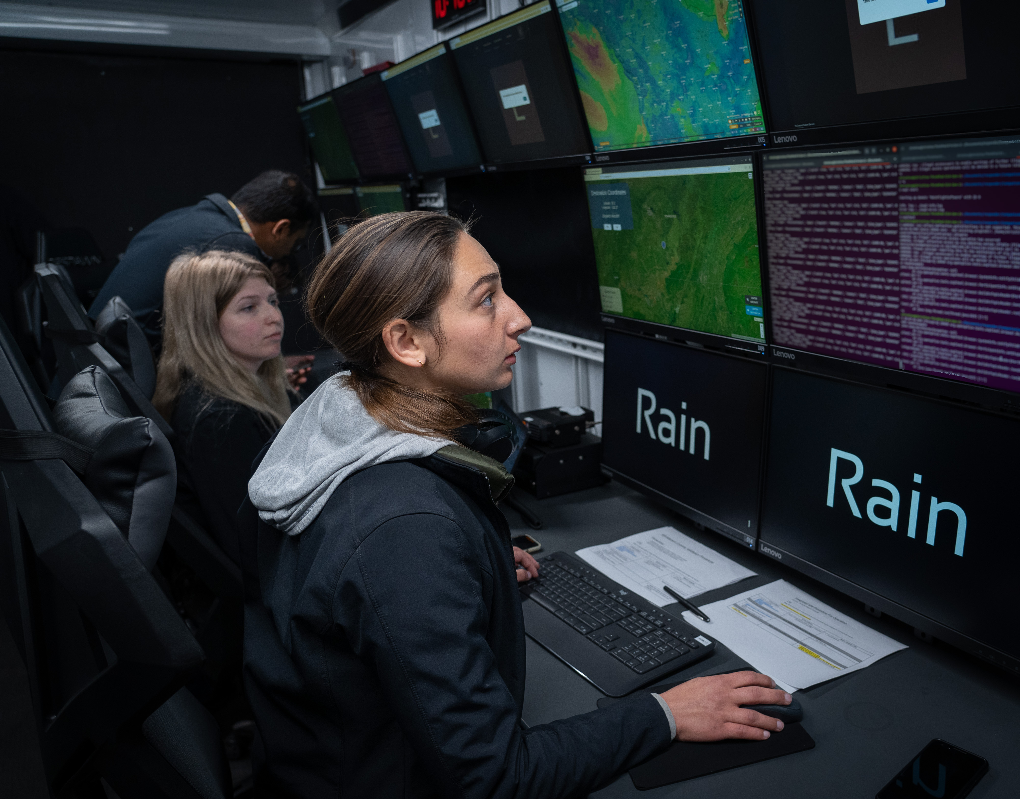 Rain engineers Christina and Katie remotely monitor the aircraft and mission progress from the control center in California.