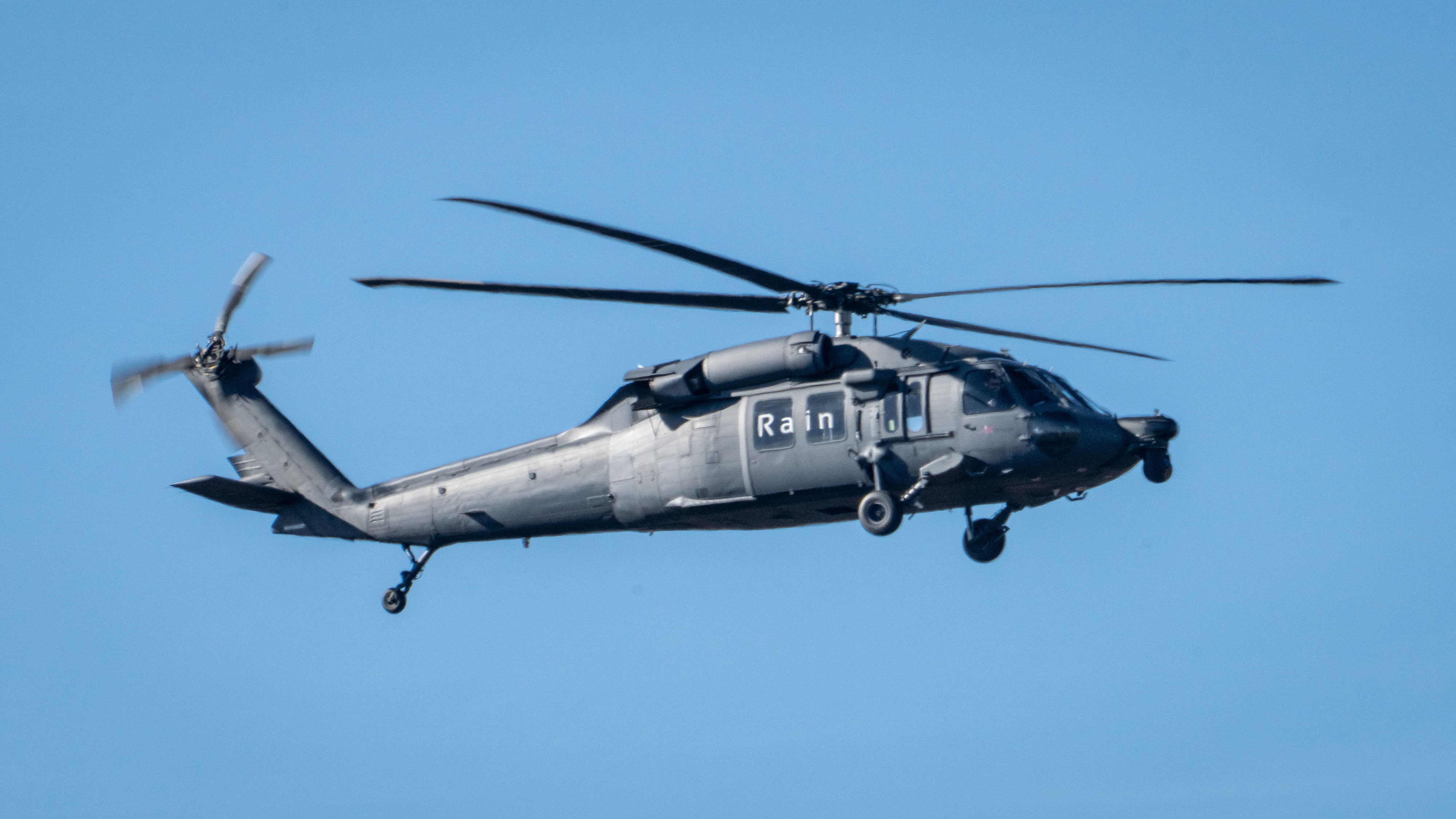 A UH-60 Black Hawk equipped with the Rain Aircraft Integration Kit flies a remotely commanded flight plan.