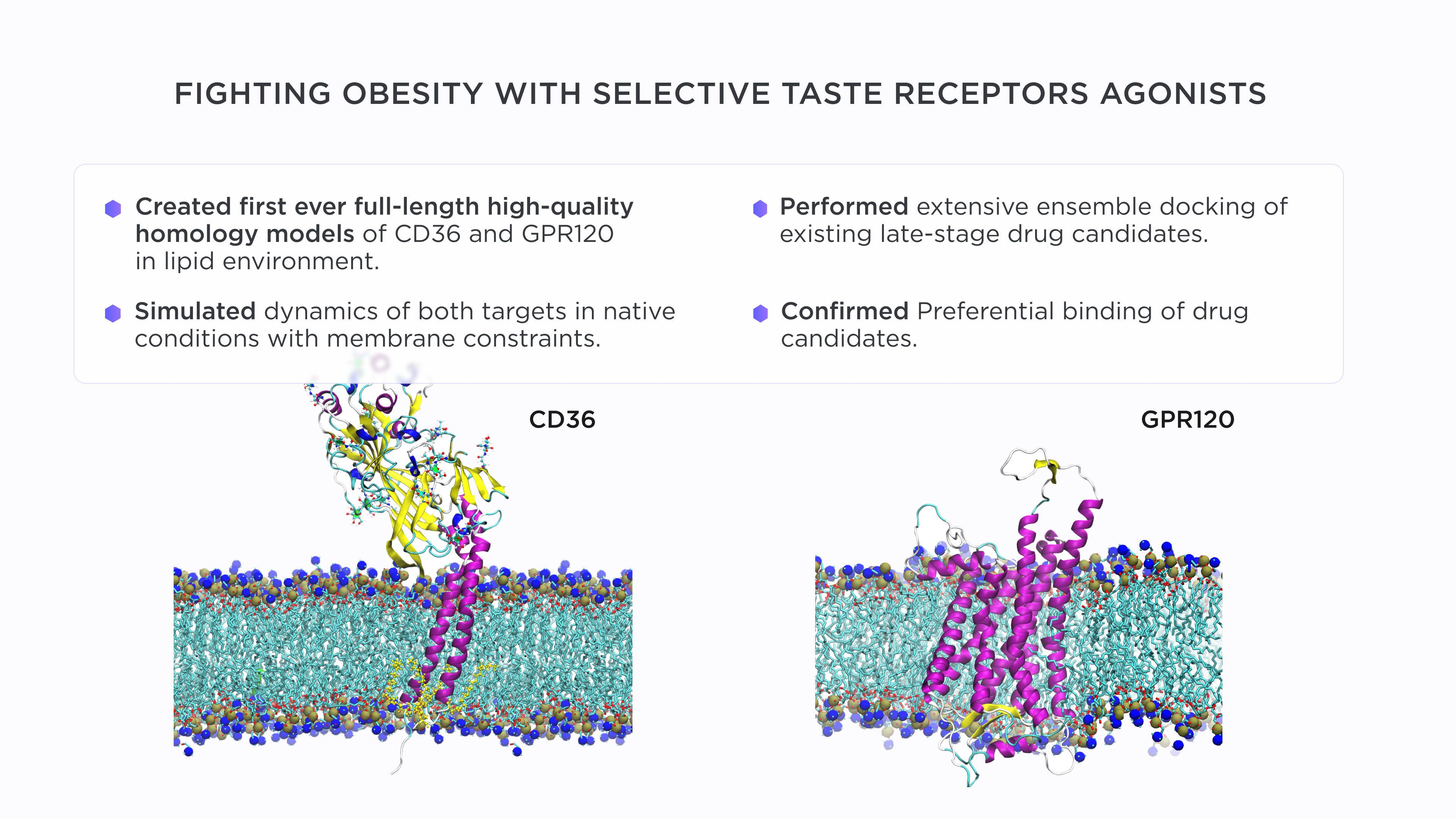 The results of ensemble docking identified two compounds – NKS-3 and NKS-5, which are prospective agonists of CD36 and GPR120. Thorough in vitro and in vivo studies confirmed that these compounds are indeed effective on different levels: Ca2+ signalling in mouse and human taste bud cells, gustatory perception and effects on activation of the tongue-gut loop in obese mice models, and, finally, on the prevention of weight gain in mice, fed a high-fat diet.