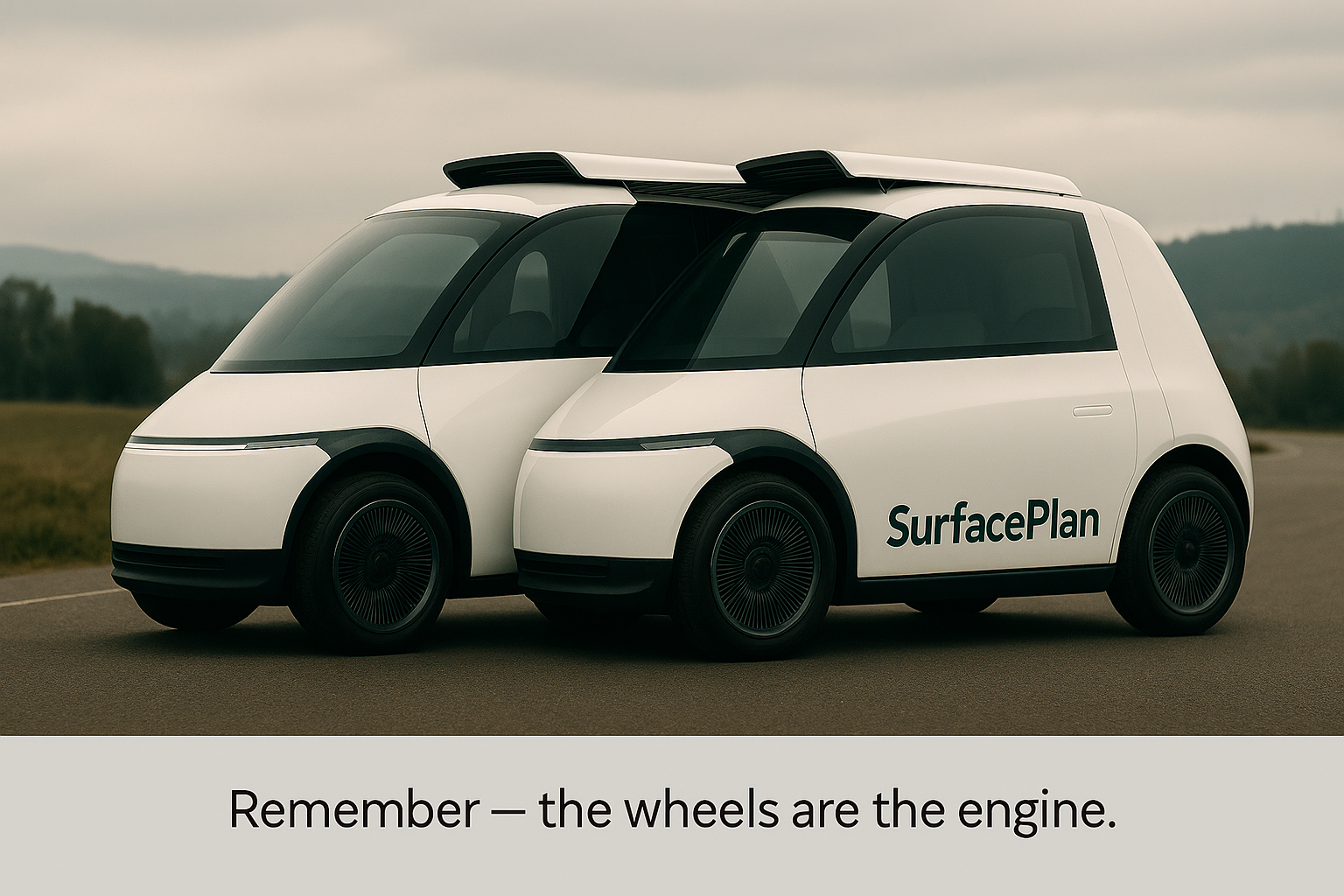 Detailed in a comprehensive provisional patent filing, the SurfacePlan system addresses key engineering challenges including power delivery, durability, and high-speed stability through innovative solutions like directional stabilizing elements for maintaining optimal ground contact.