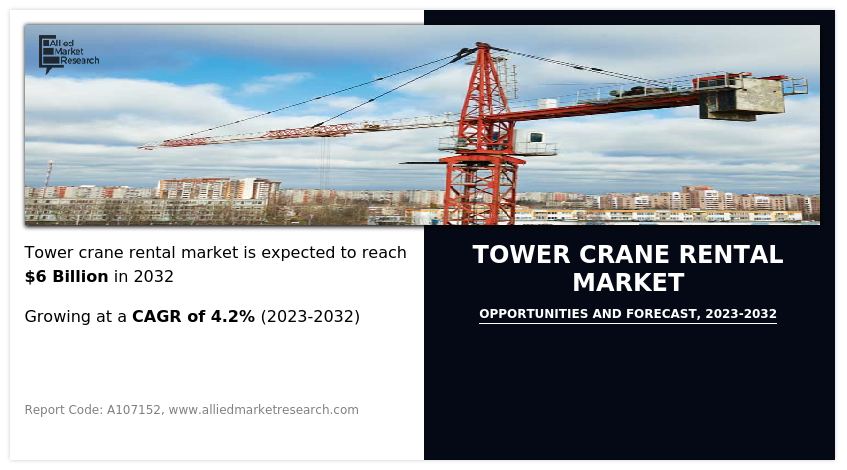 PORTLAND, UNITED STATES, July 31, 2023/EINPresswire.com/ — According to a new report published by Allied Market Research, titled, “Tower Crane Rental Market,” The tower crane rental market was valued at $3.8 billion in 2020, and is estimated to reach $6 billion by 2032, growing at a CAGR of 4.2% from 2023 to 2032.