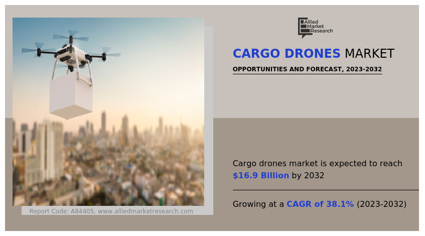 PORTLAND, OREGAON, UNITED STATES, October 26, 2023 /EINPresswire.com/ — According to a new report published by Allied Market Research, titled, “Cargo Drones Market,” The cargo drones market was valued at $0.68 billion in 2022, and is estimated to reach $16.9 billion by 2032, growing at a CAGR of 38.1% from 2023 to 2032.