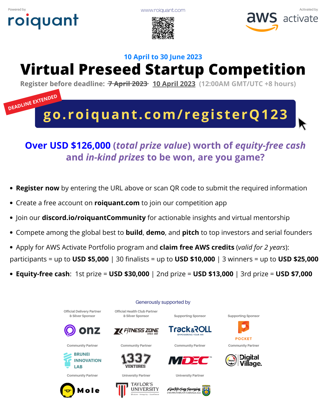 – As an official AWS Activate Provider, roiquant will also be offering free AWS Activate credits: USD $25,000 worth of AWS credits for top three winners, USD $10,000 worth of AWS credits for top 30 finalists, and USD $5,000 worth of AWS credits for all eligible participants