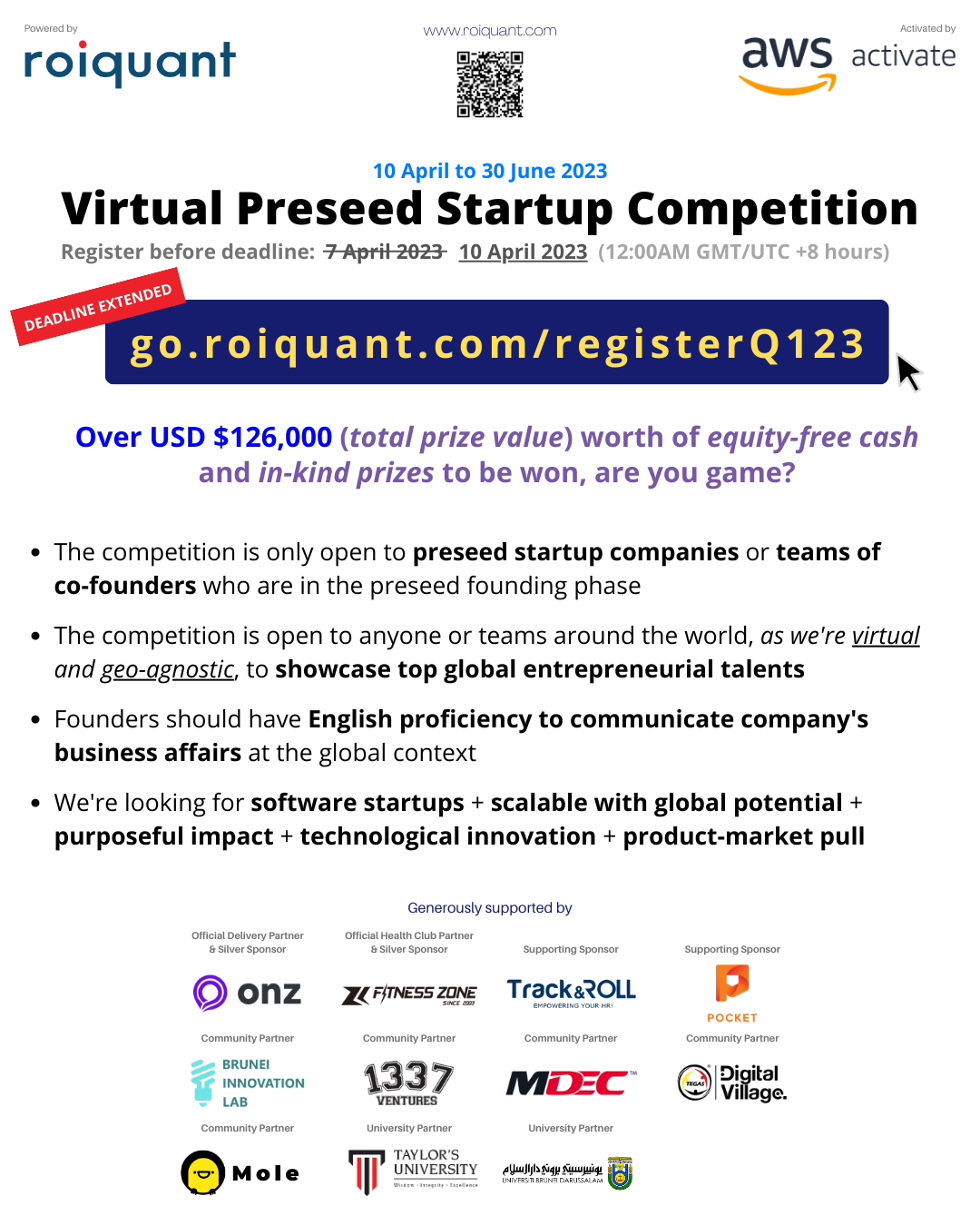 BANDAR SERI BEGAWAN, BRUNEI-MUARA, BRUNEI, April 4, 2023/EINPresswire.com/ — roiquant, a provider of cloud-based business decision support system for startup founders, is virtually hosting its preseed startup competition on 10 April till 30 June 2023 to help underrepresented founders access smart capital funding.