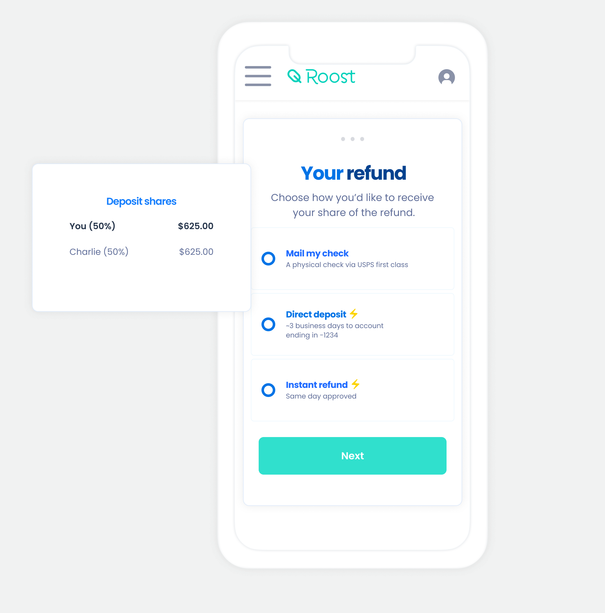Roost’s new features are designed to give roommates both flexibility and control over how they manage their money together. At move-in, roommates can pay just their share of the security deposit. During their lease, they earn interest rewards on the security deposit balance and can even take a small deposit advance to cover an emergency. While all roommates consent to remain fully responsible for any damage charges, each can pick their preferred refund option (direct deposit or check) at move-out and receive their share of the refund directly.