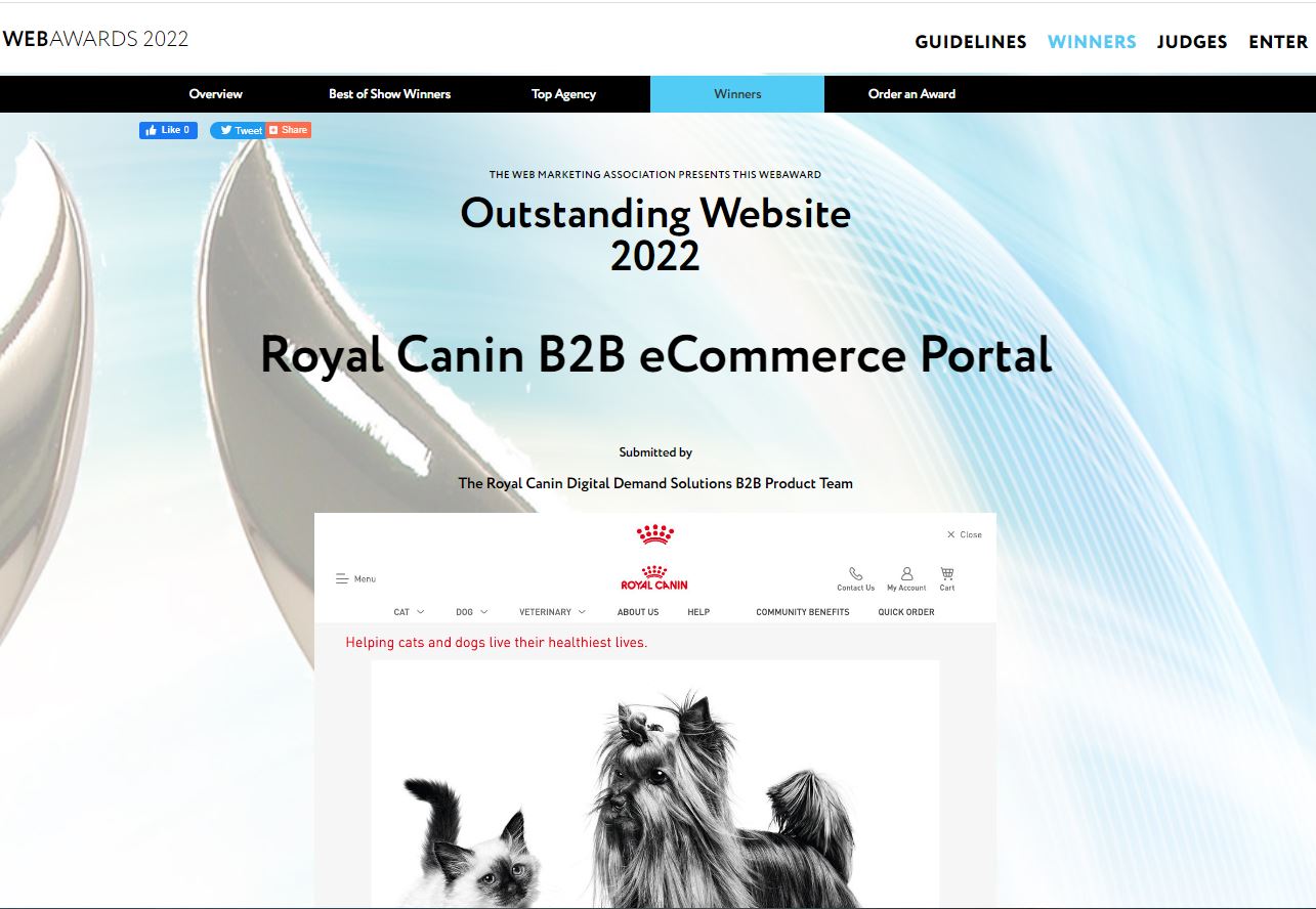 “It is an honor to accept this 2022 award on behalf of Royal Canin for Outstanding Website,” states Ashley Peth, Royal Canin Digital Demand Solutions – B2B Product Lead. “Past and present team members have contributed to the great success of our B2B platform over the last 7 years. I could not be prouder to lead this product and team! I look forward to what the future holds for B2B, and especially with Xngage’s partnership, our digital transformation will continue to evolve.”