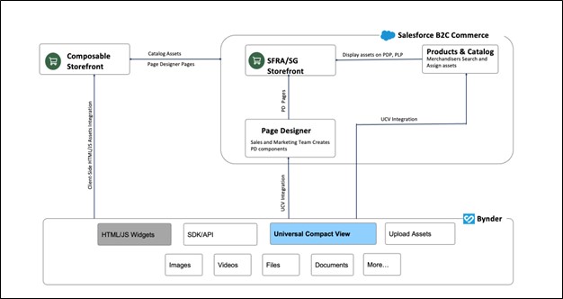 On the frontend, custom React components within the Salesforce PWA Kit render Bynder assets in real-time, including: