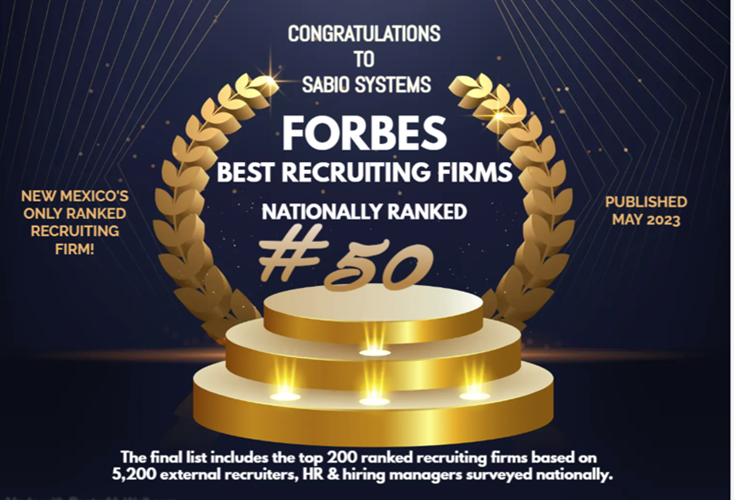 ALBUQUERQUE, NEW MEXICO, UNITED STATES, July 12, 2023/EINPresswire.com/ — Sabio Systems, a leading staffing and recruiting agency based in New Mexico, is proud to announce its inclusion in Forbes magazine’s prestigious list of top 50 America’s Best Professional Recruiting Firms. Placing at number 50, Sabio Systems has achieved this remarkable feat, highlighting its dedication and expertise in the industry.