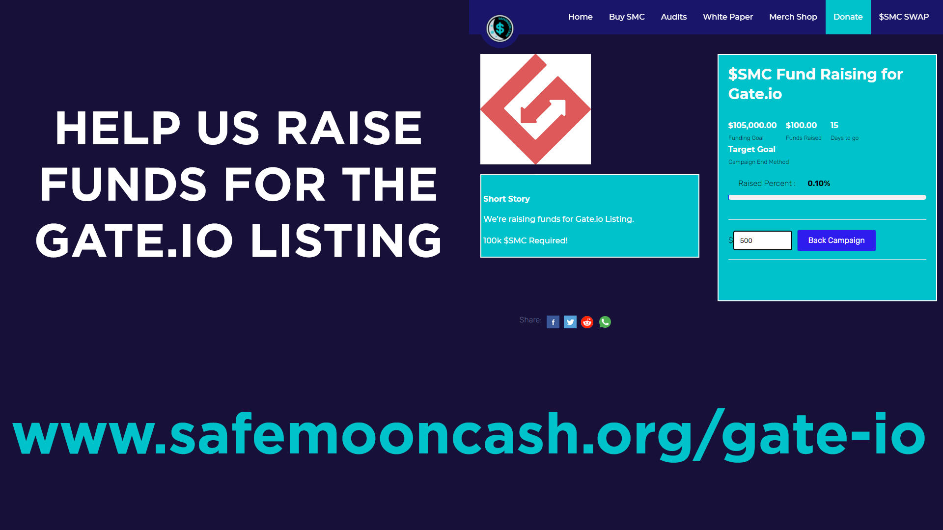 The fundraising page can be found at the project’s website, https://www.safemooncash.org/gate-io
