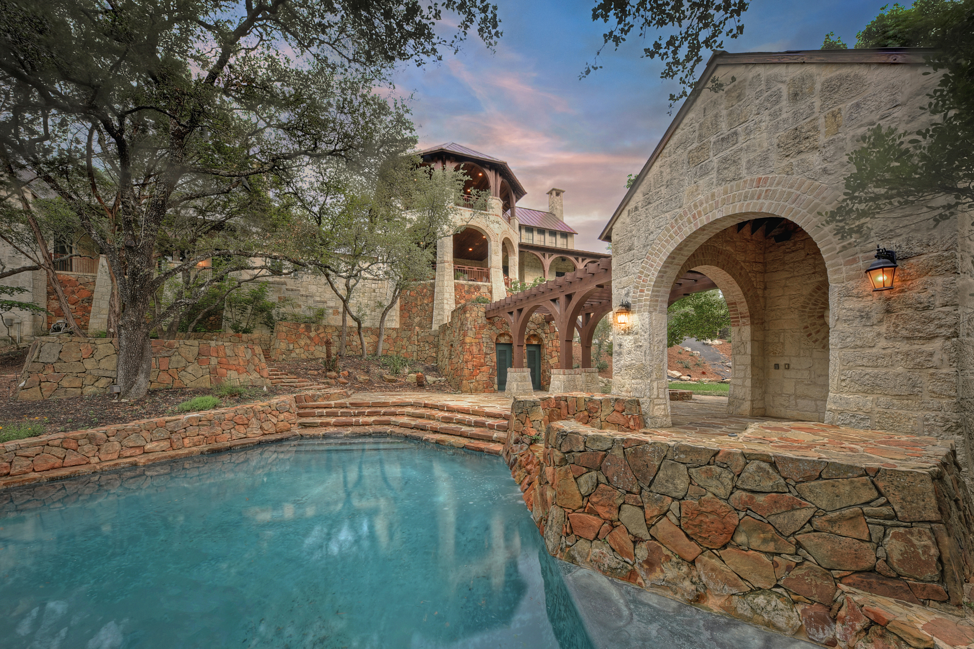 Luxury and security are cornerstones of this premier property. Designed and built-in collaboration with Braswell and Kenigstein, the home features incredible architectural design and sensational views of Texas Hill Country. The estate offers five bedrooms, six full and two half bathrooms, among several living spaces that are ideal for entertaining. Limestone walls and beamed ceilings accentuate the home and are complemented by rich woodwork and antique pieces throughout. The spacious kitchen is an ideal gathering place, complete with an oversized, eat-in island, butler’s pantry, gas appliances, separate dining area, and access to the home’s expansive, stone veranda. The master suite is a retreat all its own, complete with access to the outdoor veranda, separate sitting area, and a spa-like master bathroom with walk-in shower and clawfoot bathtub. Other notable living spaces inside the home include a media room with full bar, game room, office, and an incredible living room complete with an abundance of natural light and limestone, see-through gas fireplace. The crowning features of this home are its outdoor spaces. The estate’s expansive veranda offers spectacular views of Texas Hill Country, as well as offers multiple seating areas and outdoor barbecue area. The grounds of the property are filled with lush, manicured landscaping with mature trees and a koi pond. Additionally, the estate boasts an idyllic pool with attached spa, separate bath, covered patio area, and fire pit.