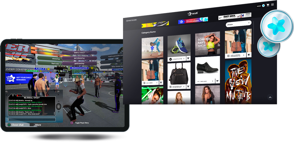 Scuti$™ are a rewards system backed by a Stablecoin pegged to the US Dollar, designed to be interoperable across all games and devices. Players exchange their brand-fueled Scuti$™ for native game currency, to make in-game purchases, purchase NFT-tied items, donate them to charity, or redeem them for physical products and services available through the Scuti Marketplace.