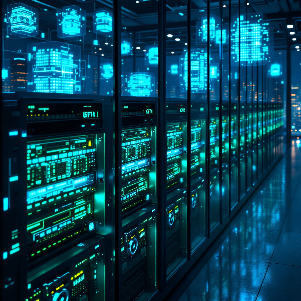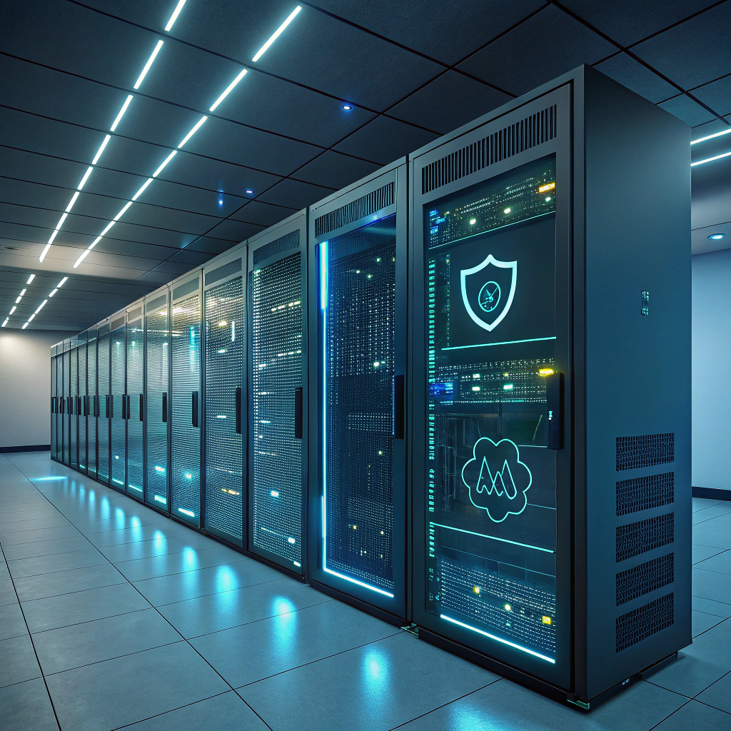 An ultra-modern server room illuminated in ambient lights, showing advanced security interfaces overlaid with transparent data panels. Each server unit has an AI-inspired design with distinct lights and locked symbols, showcasing the concept of dedicated