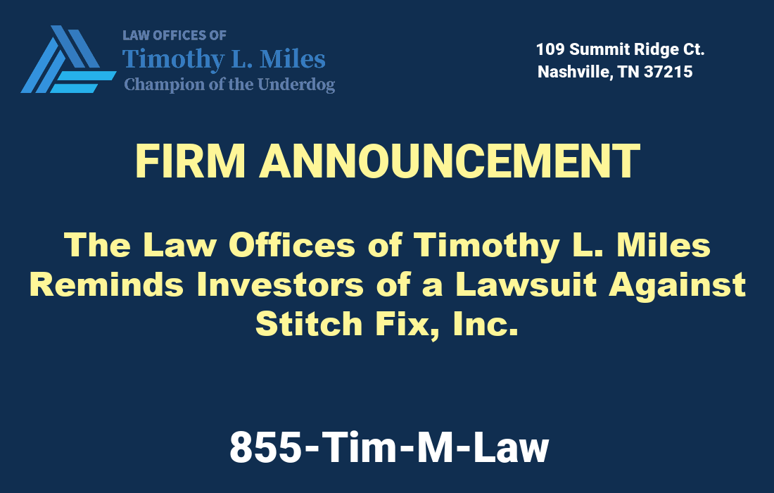 SHAREHOLDER ALERT: The Law Offices of Timothy L. Miles Reminds Investors of a Lawsuit Against Stitch Fix, Inc.