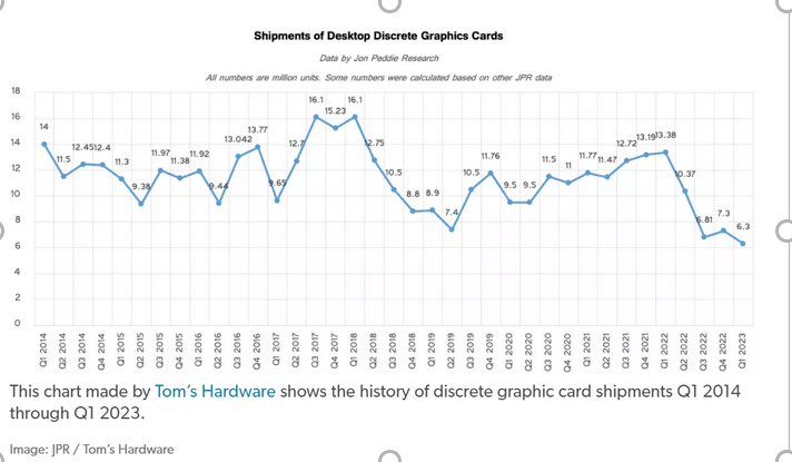 SAN JOSE, CALIFORNIA, USA, July 5, 2023/EINPresswire.com/ — The graphics card market is may witness a price drop due to a decline in shipments. According to the report by Jon Peddie Research, sales in the first quarter of 2023 have dropped by 38% when compared with the same period last year and a 12% decrease compared to the previous quarter of 2022. The sales figures have dropped to 6.3 million units in the first quarter (down from 7.16 million units last quarter), the lowest quarterly sales in decades, as historical data shows.