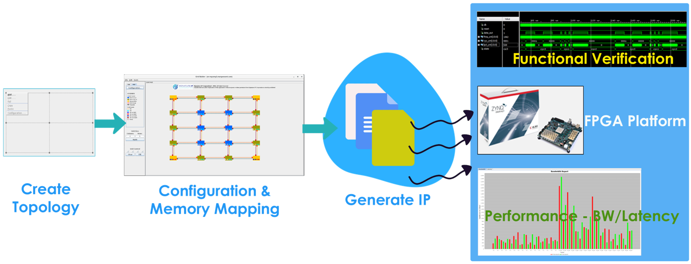 iNoCulator enables interactive whiteboard editing of the NoC topology through connection of initiators, routers and endpoints, and easy configuration. It supports on-the-fly instant simulation of bandwidth and latency, and estimation of power and area. iNoCulator provides pushbutton RTL generation with targets to an SoC design flow or to an FPGA emulation flow.