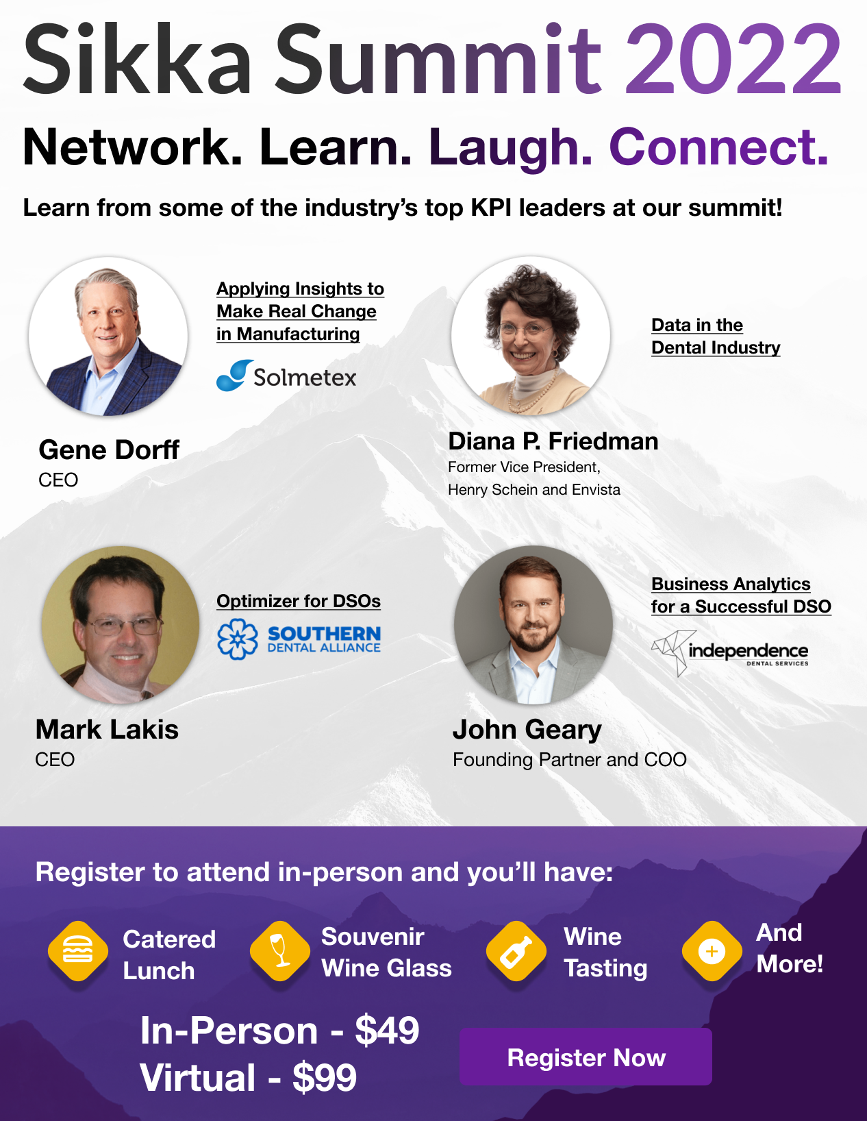 At the Sikka Summit 2022, you will hear from esteemed speakers and industry leaders such as Gene Dorff (CEO of Solmetex), Diana Friedman (Former Vice President for Henry Schein and Envista), John Geary (Founding Partner & COO of Independence Dental Services) and Mark Lakis (CEO of Southern Dental Alliance).