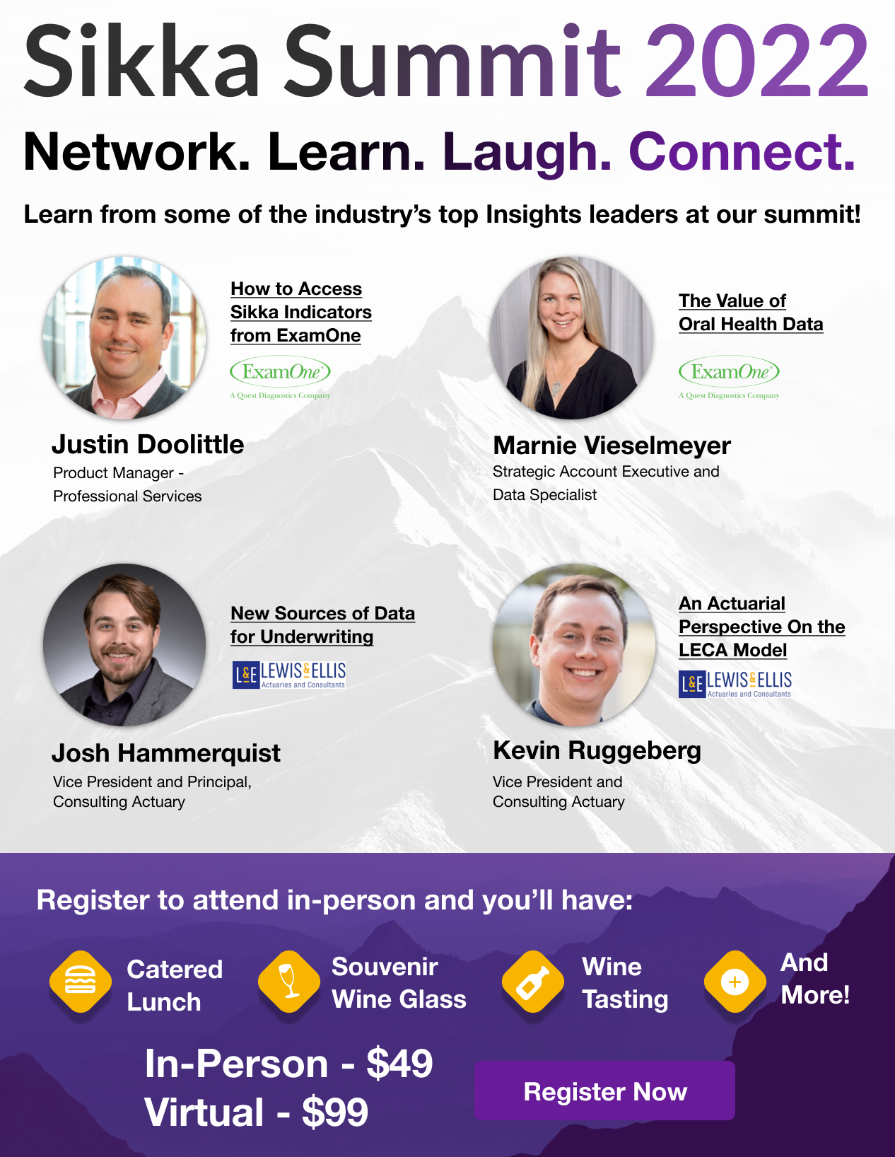 At the Sikka Summit 2022, you will hear from esteemed speakers and industry leaders such as Marnie Vieselmeyer (Strategic Account Executive & Data Specialist at ExamOne), Justin Doolittle (Product Manager at ExamOne), Josh Hammerquist (Vice President & Principal / Consulting Actuary at Lewis & Ellis, Inc.) and Kevin Ruggeberg (Vice President & Consulting Actuary at Lewis & Ellis, Inc.).
