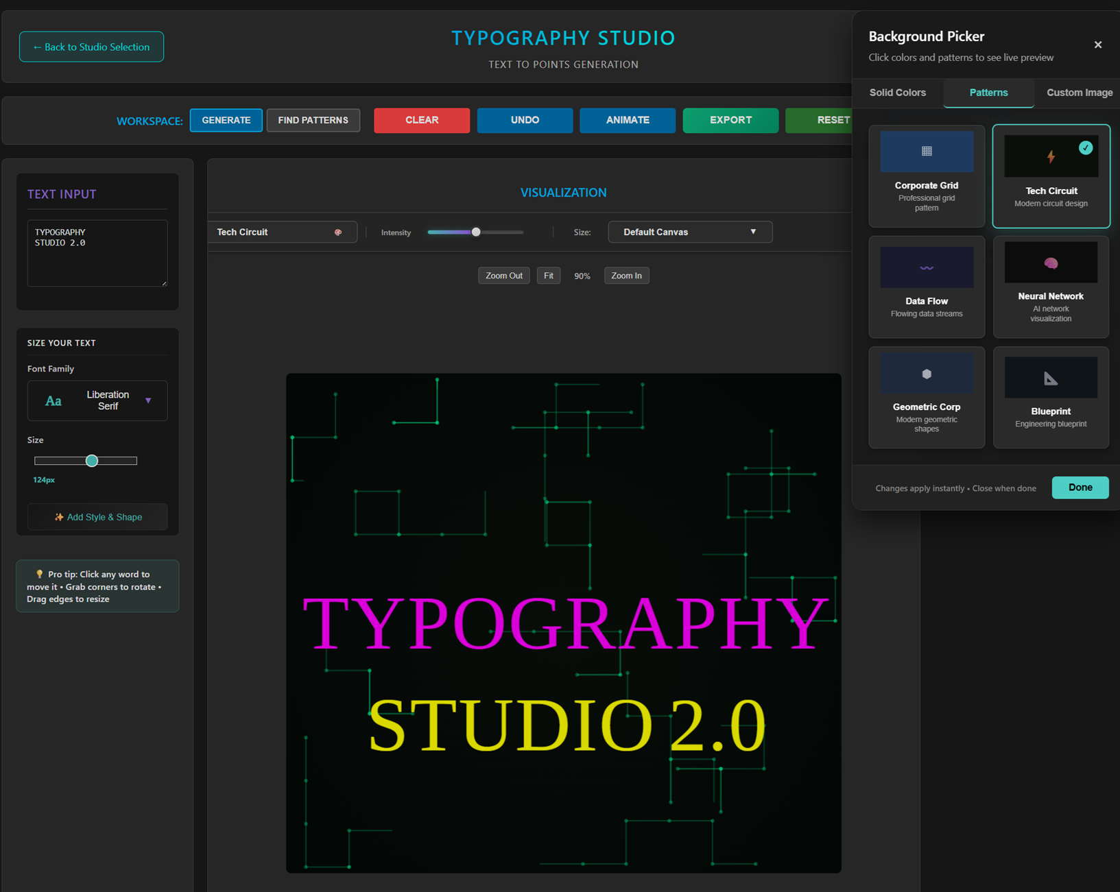 Typography Studio 2.0’s dynamic mathematical background engine showing Tech Circuit pattern selection with professional color controls and real-time intensity adjustment – demonstrating infinite algorithmic pattern possibilities.