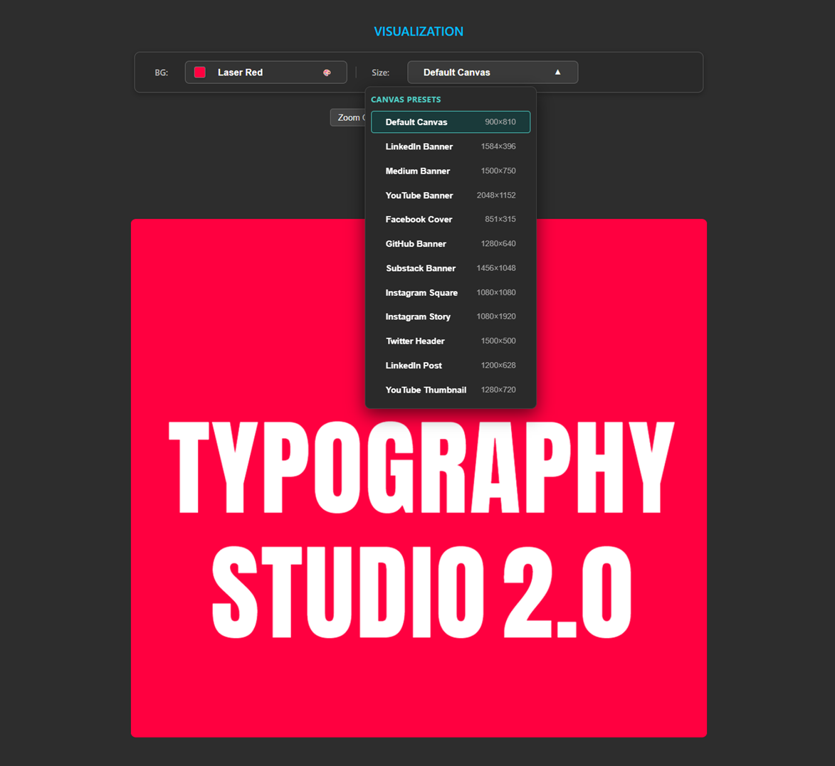 Typography Studio 2.0 eliminates the need for separate platform pages entirely. Previously requiring dedicated web forms for each social media platform, users now simply select their target platform from a comprehensive dropdown menu and watch the canvas instantly resize to perfect dimensions—covering 11 major platforms including LinkedIn, YouTube, Facebook, Medium, GitHub, Substack, Instagram (Square and Story), Twitter, and specialized formats like YouTube thumbnails.