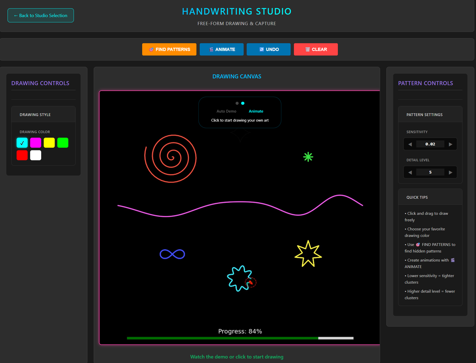 Doodle Animation Studio’s autonomous demonstration mode showing real-time sketch creation across multiple drawing styles – users witness the complete mathematical creative process before creating their own stroke-by-stroke animations.