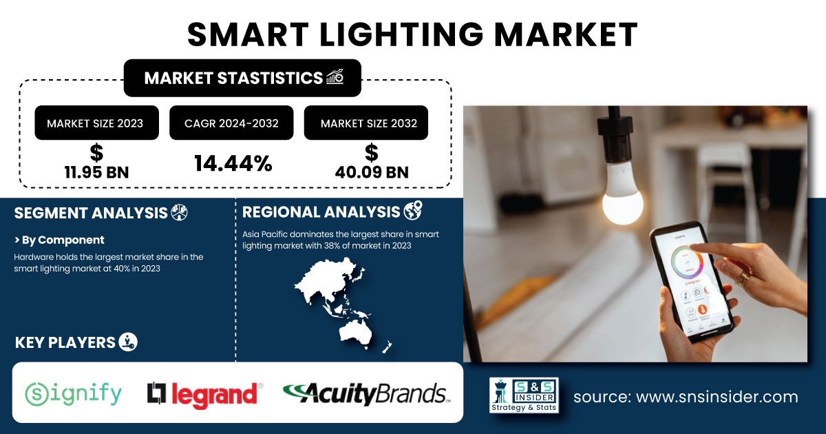 According to the SNS Insider Report,“The Smart Lighting market was valued at USD 11.95 billion in 2023 and is expected to grow to USD 40.09 billion by 2032, at a CAGR of 14.44% over the forecast period of 2024-2032.”