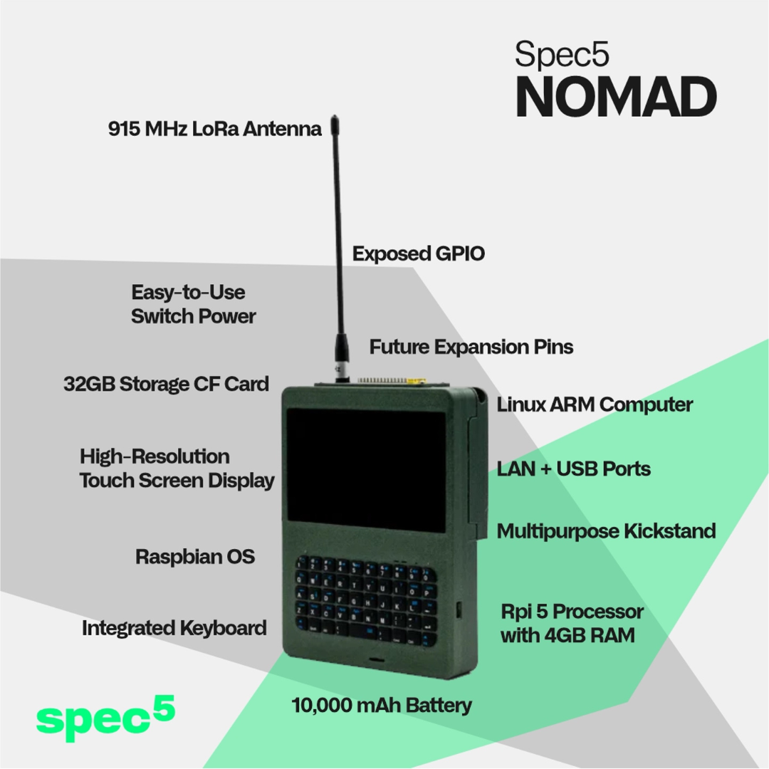 “Nomad is the ultimate tool for off-grid communications and computing,” said Amir Husain, Chairman of SpecFive. “We’ve integrated LoRa radio and pre-configured ready-to-go Meshtastic software into a Linux platform that opens up endless remote operations and long-range networking possibilities. Nomad is a game changer for everything from software-defined radio (SDR), drone detection, secure comms, IoT sensor analysis, and scientific computing in the field.”
