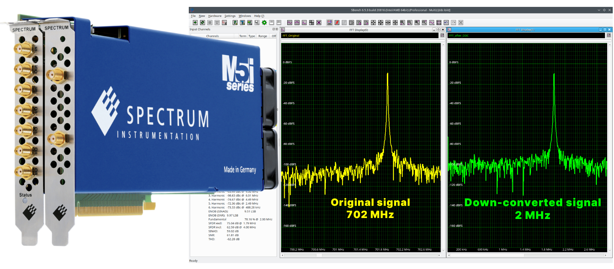 GROSSHANSDORF, GERMANY, April 19, 2023/EINPresswire.com/ — Spectrum Instrumentation’s complete line of PCIe digitizer cards can now perform Digital Down Conversion (DDC) thanks to a low-cost option that uses an external GPU-card for continuous “on-the-fly” processing. DDC is a powerful technique that is commonly used in a wide range of communication systems, like digital radio, radar, mobile telephony, space or satellite communications. In the DDC process, RF or Microwave signals are converted to baseband, which contains the signal of interest. The conversion dramatically reduces the resultant data set while also improving signal quality and measurement accuracy. Spectrum Instrumentation has 48 different PCIe-based digitizers (with sampling speeds from 5 MS/s to 10 GS/s) that can run the new DDC function, so customers can select the “Perfect-Fit” model for their application.
